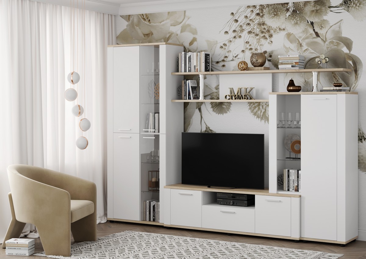 Неоклассическую стенку Соло-10(А) можно описать тремя словами: монументальность, изящество, строгость. Она будет замечательно смотреться в просторных гостиных.