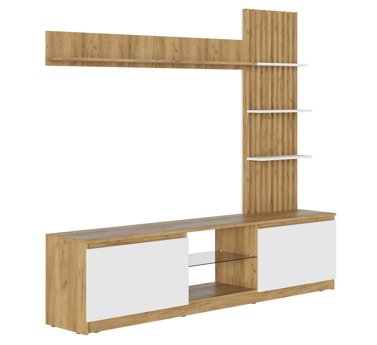 •    Ниша под телевизором оборудована стеклополкой из тонированного стекла в цвете Графит, края обработаны еврокромкой