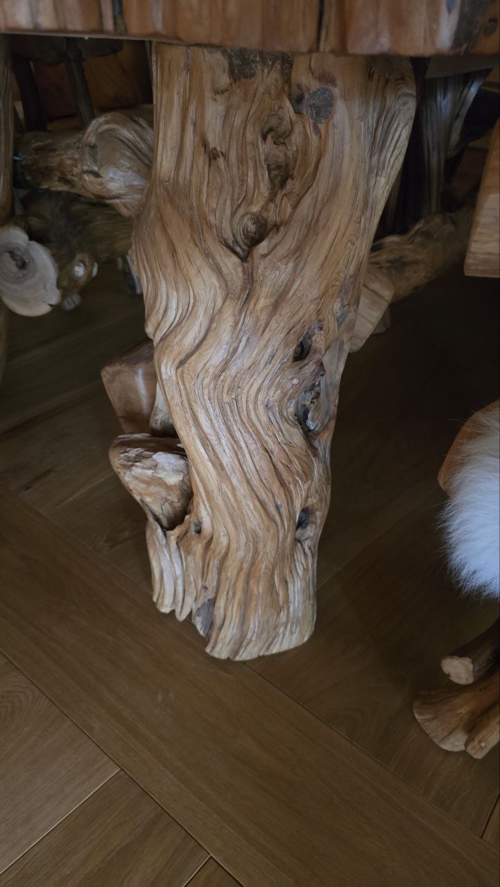 Стол из древесины можжевельника, без синтетики и вредных покрытий. Интересный дизайн, стиль “Wild nature”, стол изготовлен из пней, коряг, веток, фрагментов старых стволов с крупными сучками можжевелового дерева. Можжевельник выделяет эфирные масла, которые обладают бактерицидным, антисептическим и противовоспалительным свойством.