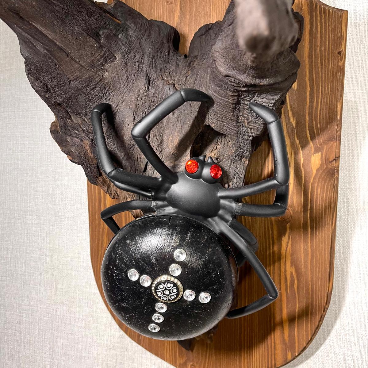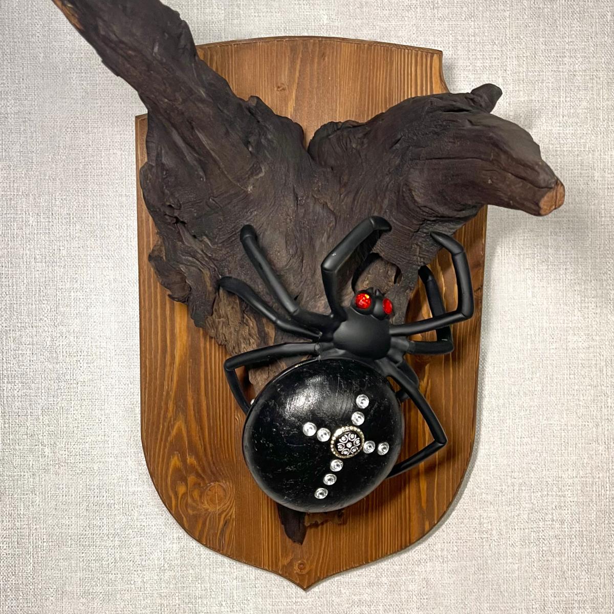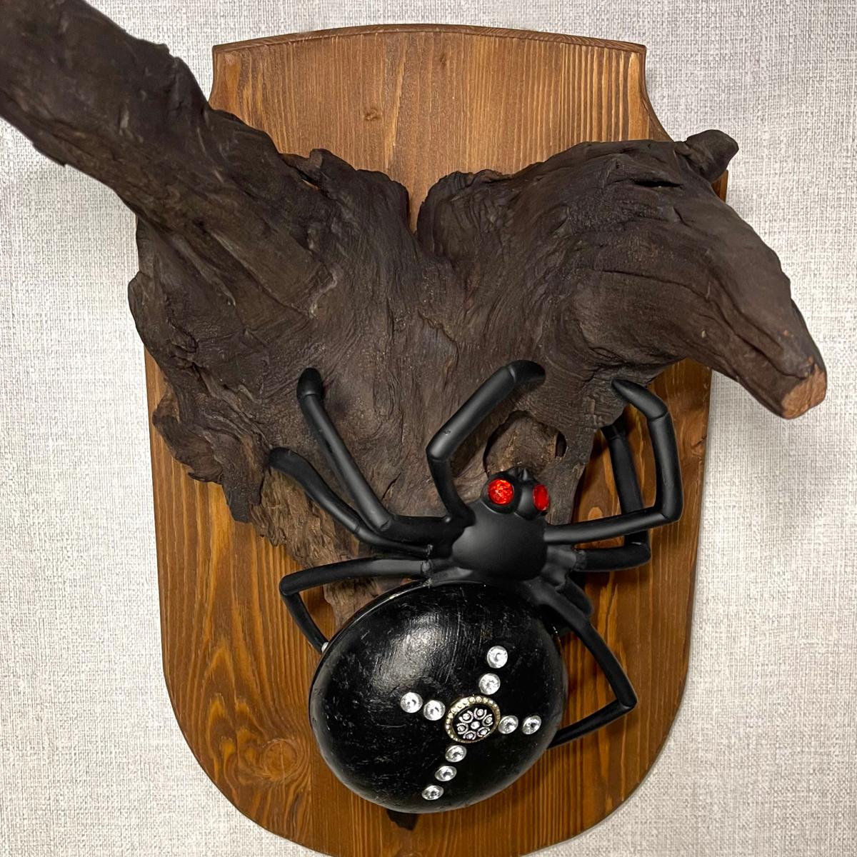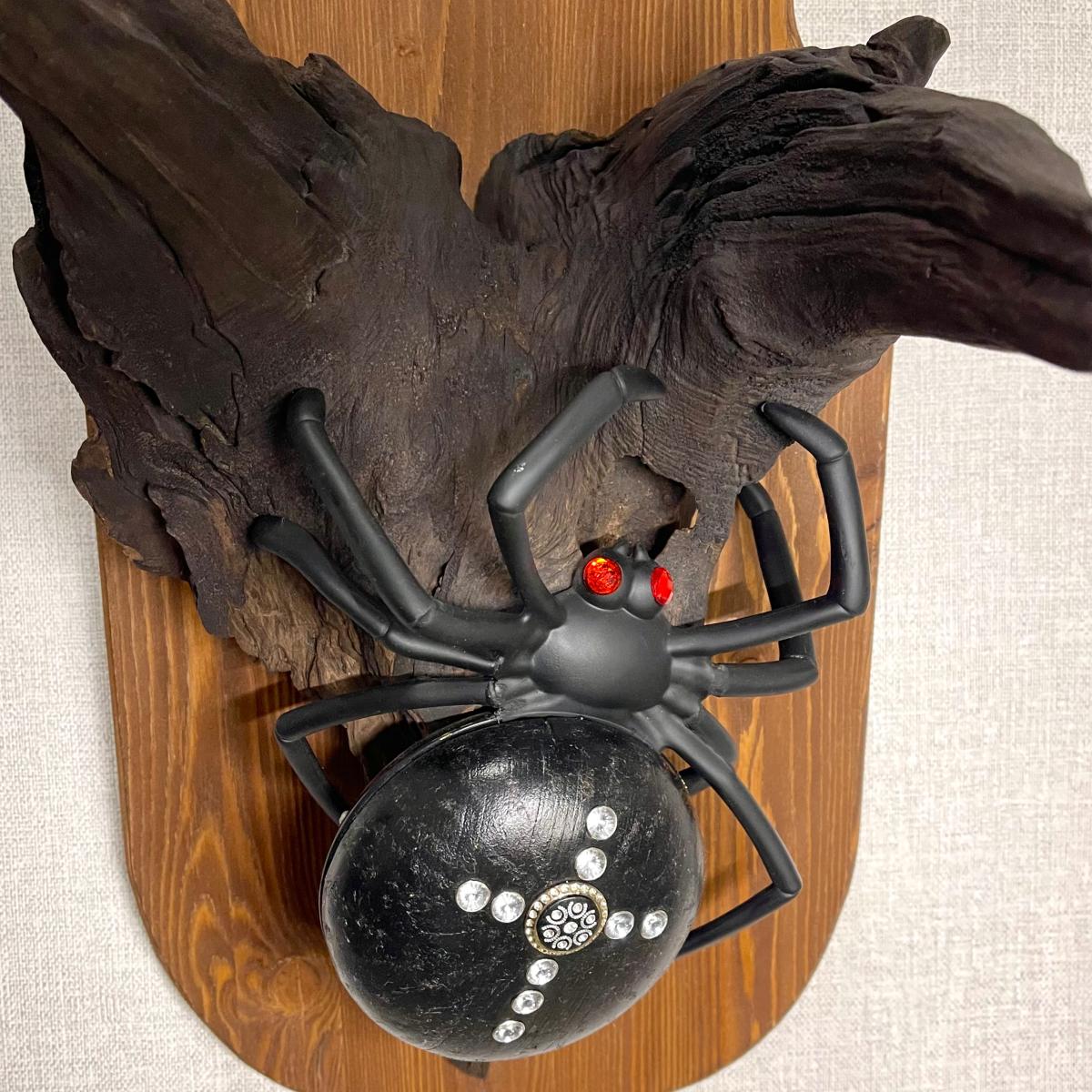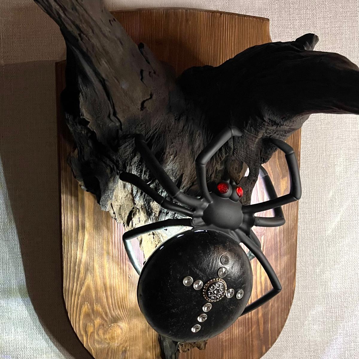 Настенное бра «Паук» из обработанного натурального дерева, представляет собой декоративный элемент для интерьера с подсветкой. Выполнено в виде черного паука на деревянной основе с имитацией коряги.