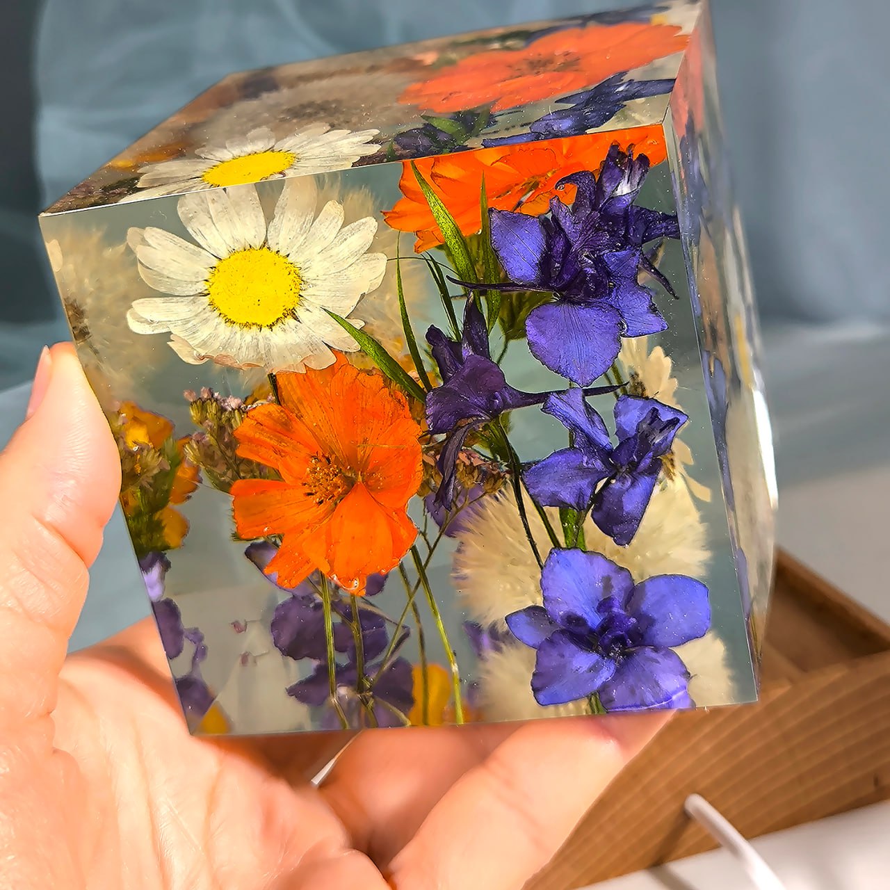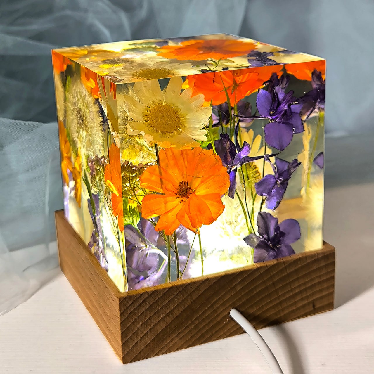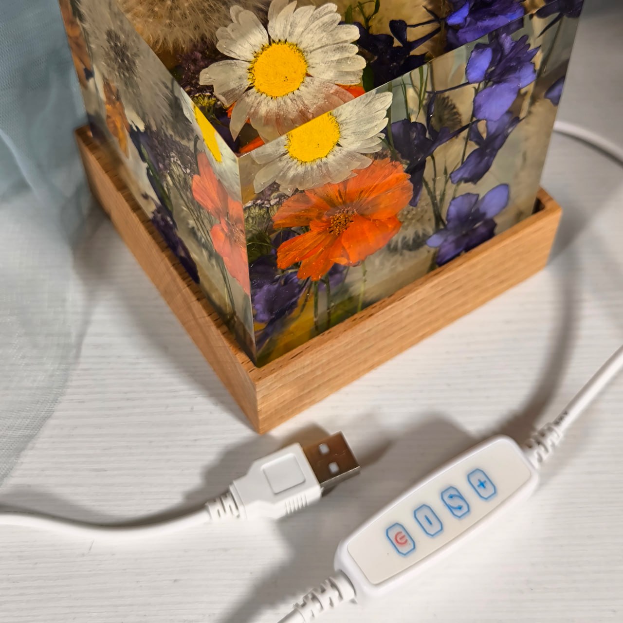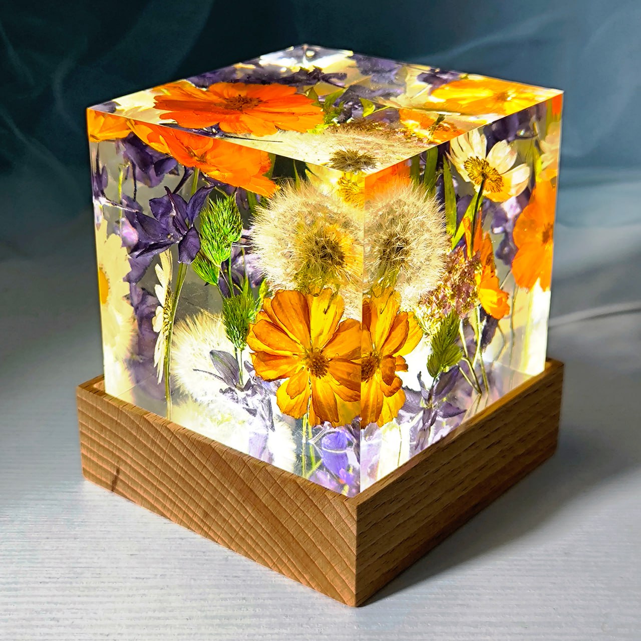 Светильник-ночник в виде монолитного куба на деревянной подставке, который станет настоящей изюминкой пространства. Светильник выполнен из прозрачной эпоксидной смолы и наполнен настоящими полевыми цветами.