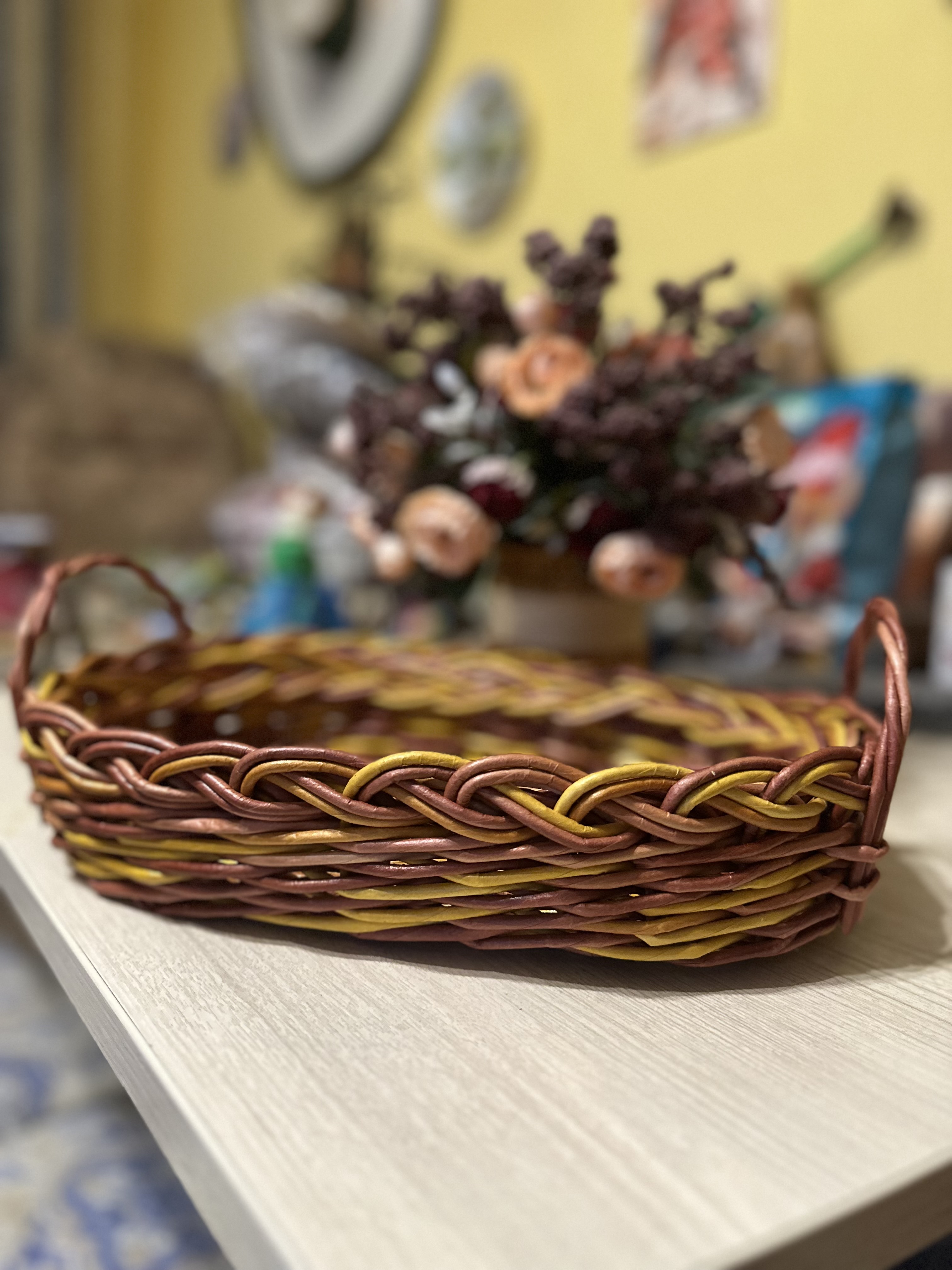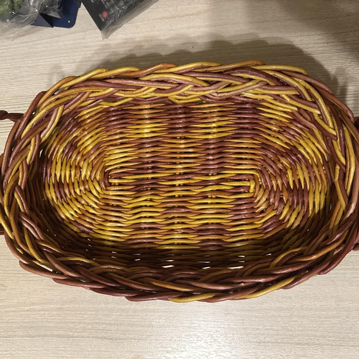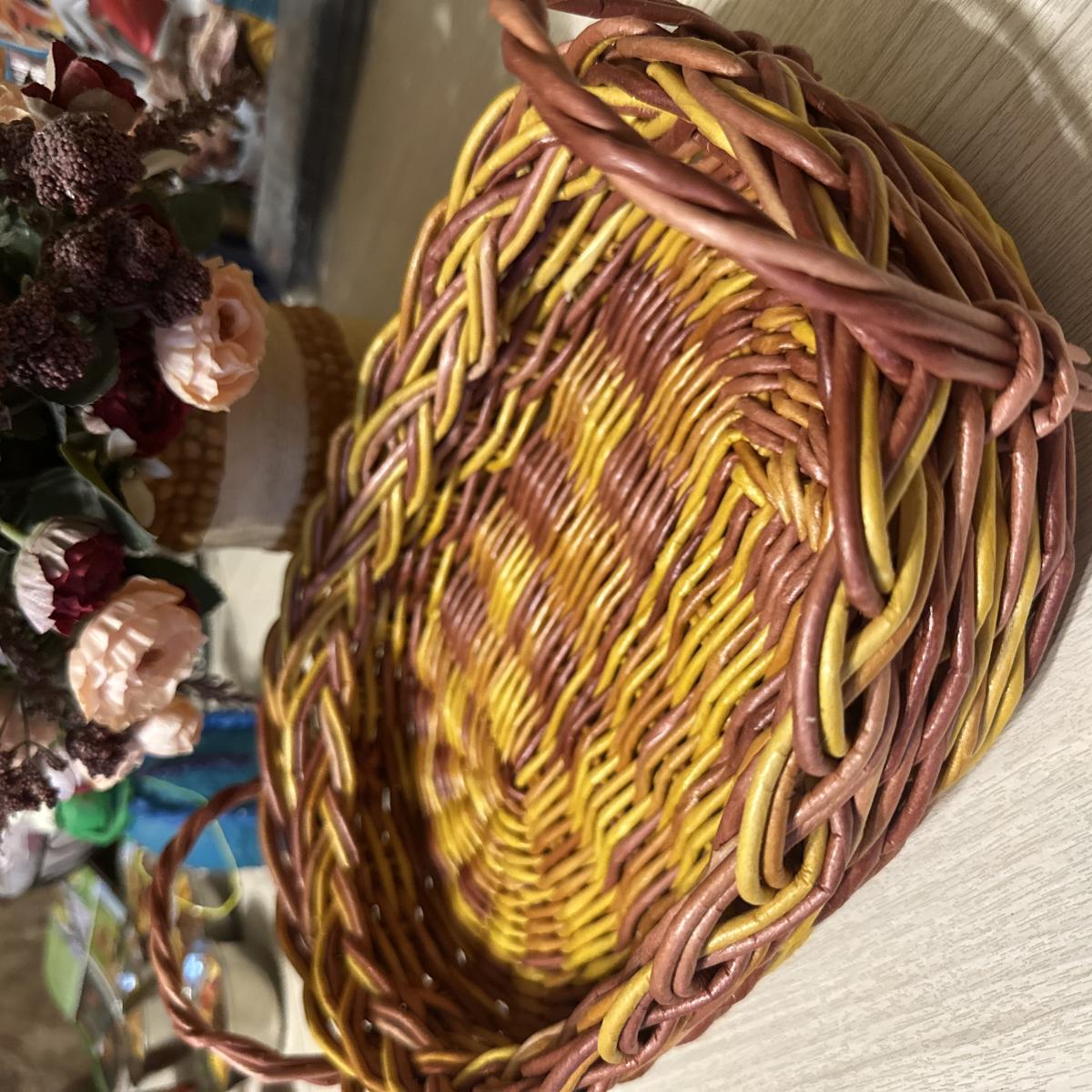Поднос сплетен вручную из бумажной лозы, обработан акриловым лаком, не боится влаги.