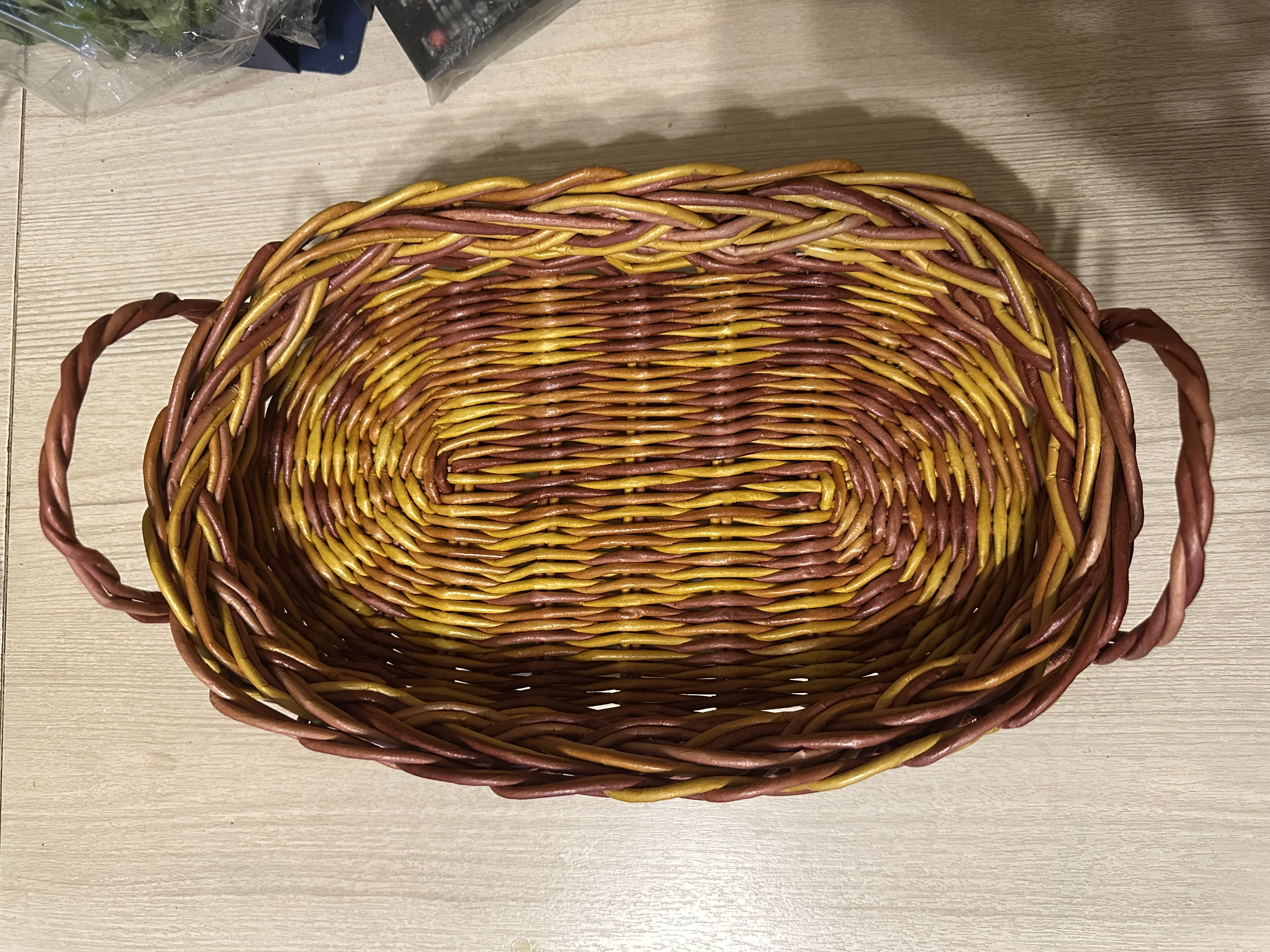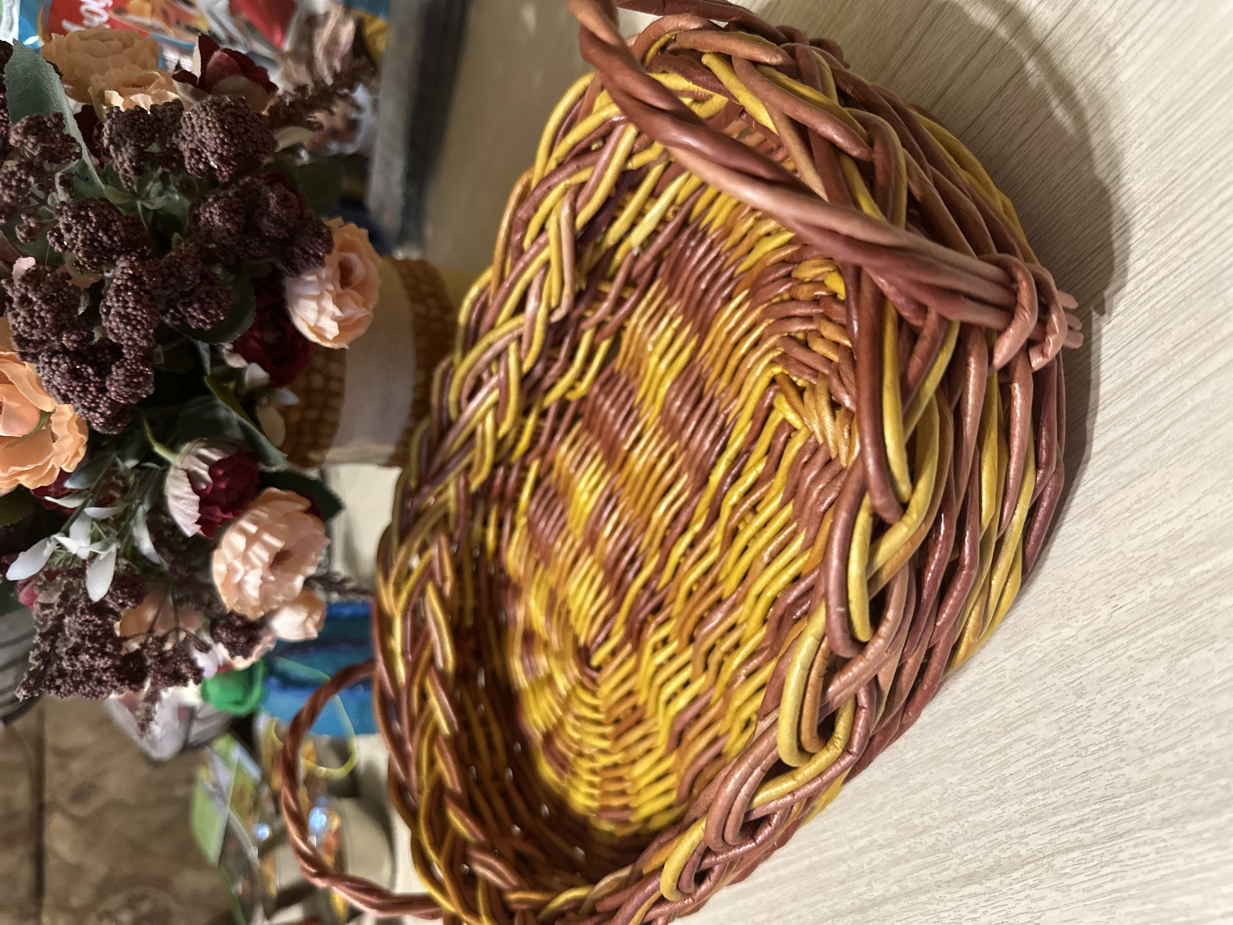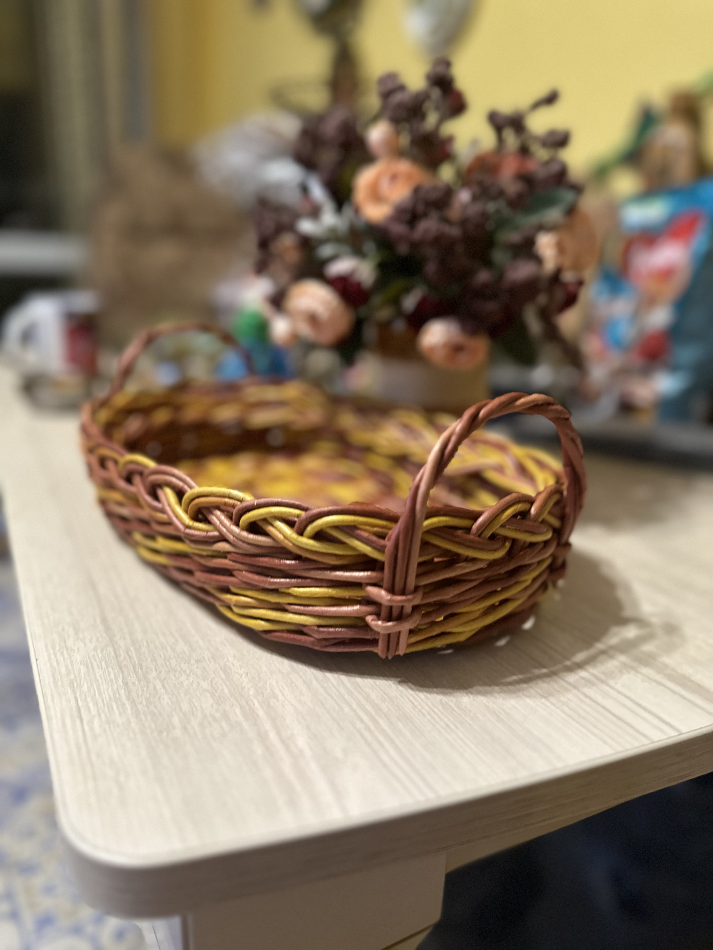 Поднос сплетен вручную из бумажной лозы, обработан акриловым лаком, не боится влаги.