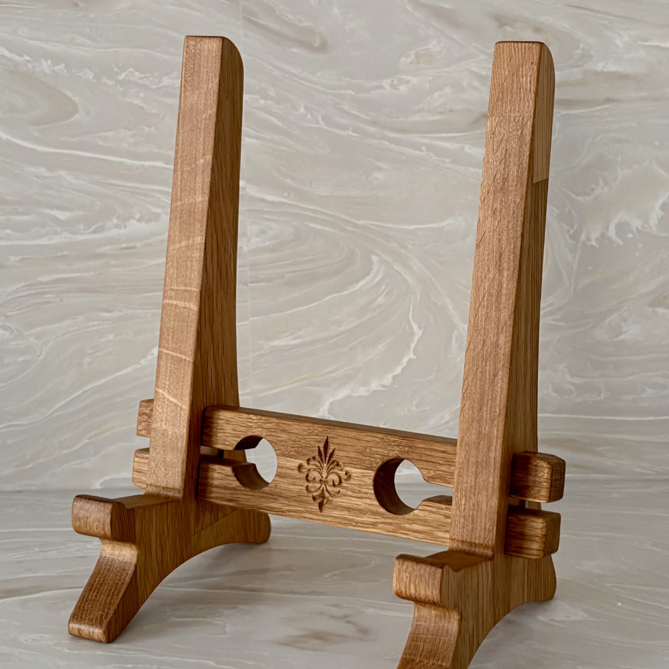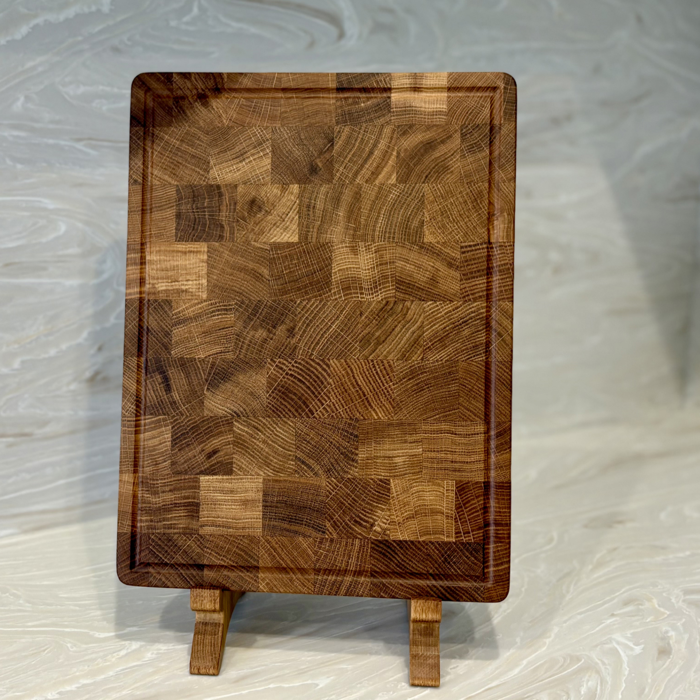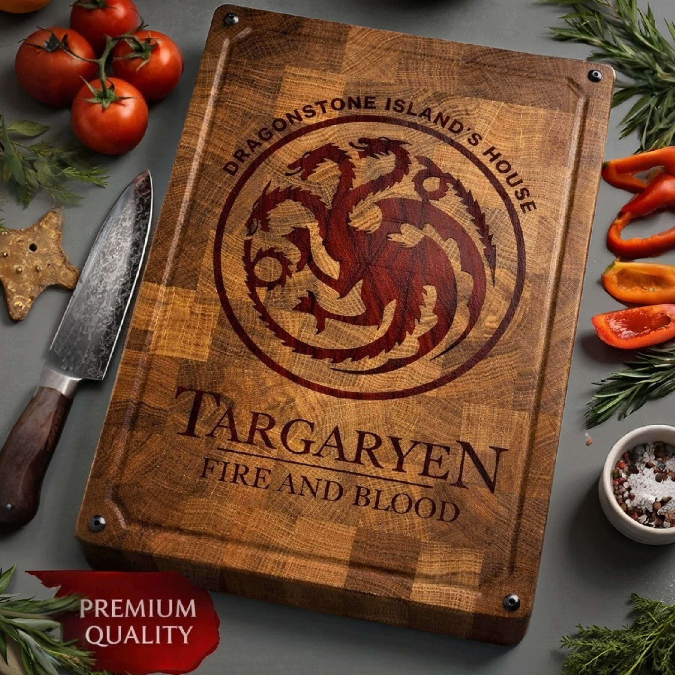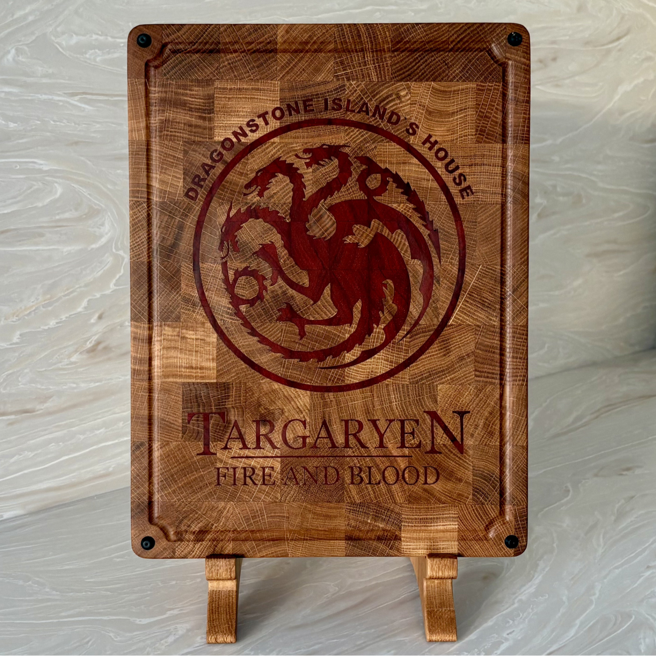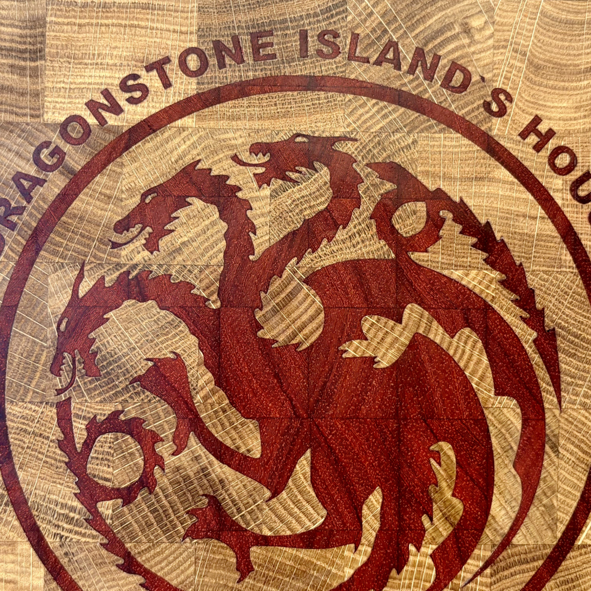 Высококачественная торцевая разделочная доска из дуба с декоративной вставкой из красного дерева (падук). На оборотной стороне выполнен рисунок техникой интарсия — в данном примере герб дома Таргариен (Игра престолов).