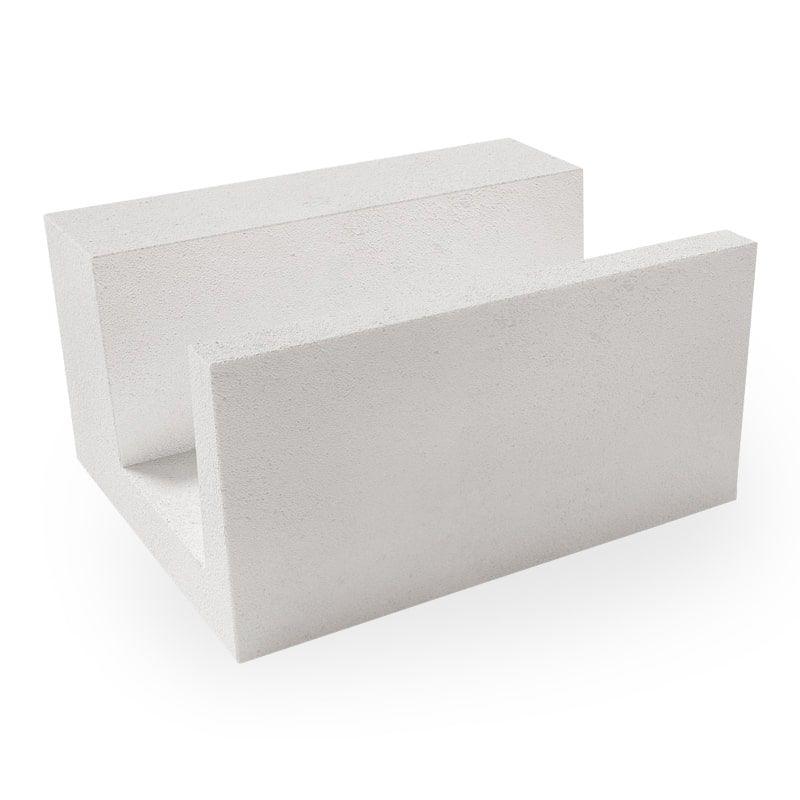Пенобетонные П-блоки ВКБлок размером 500x400x250 и плотностью D500. Применяются для создания оконных и дверных перемычек, а также для возведения монолитного пояса.