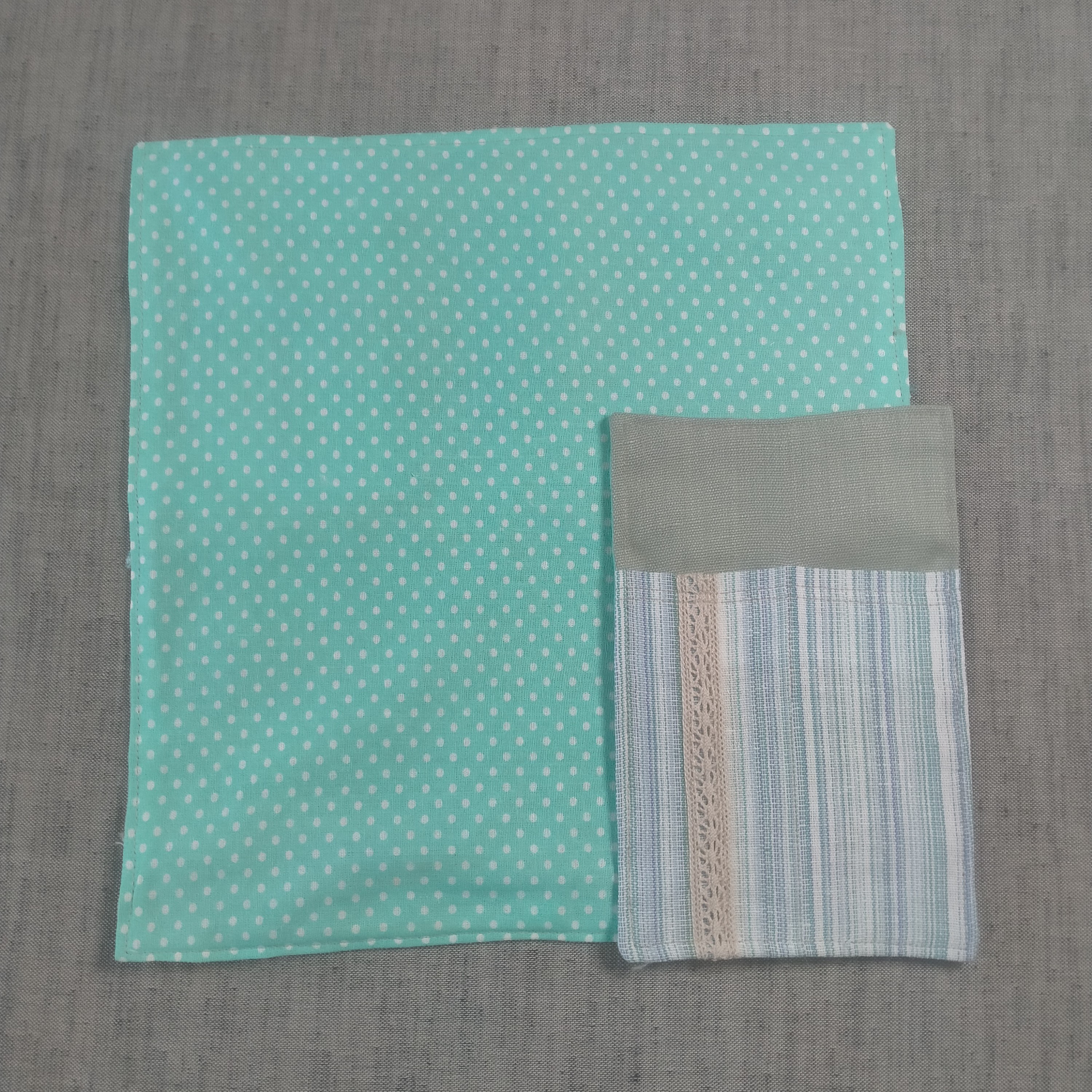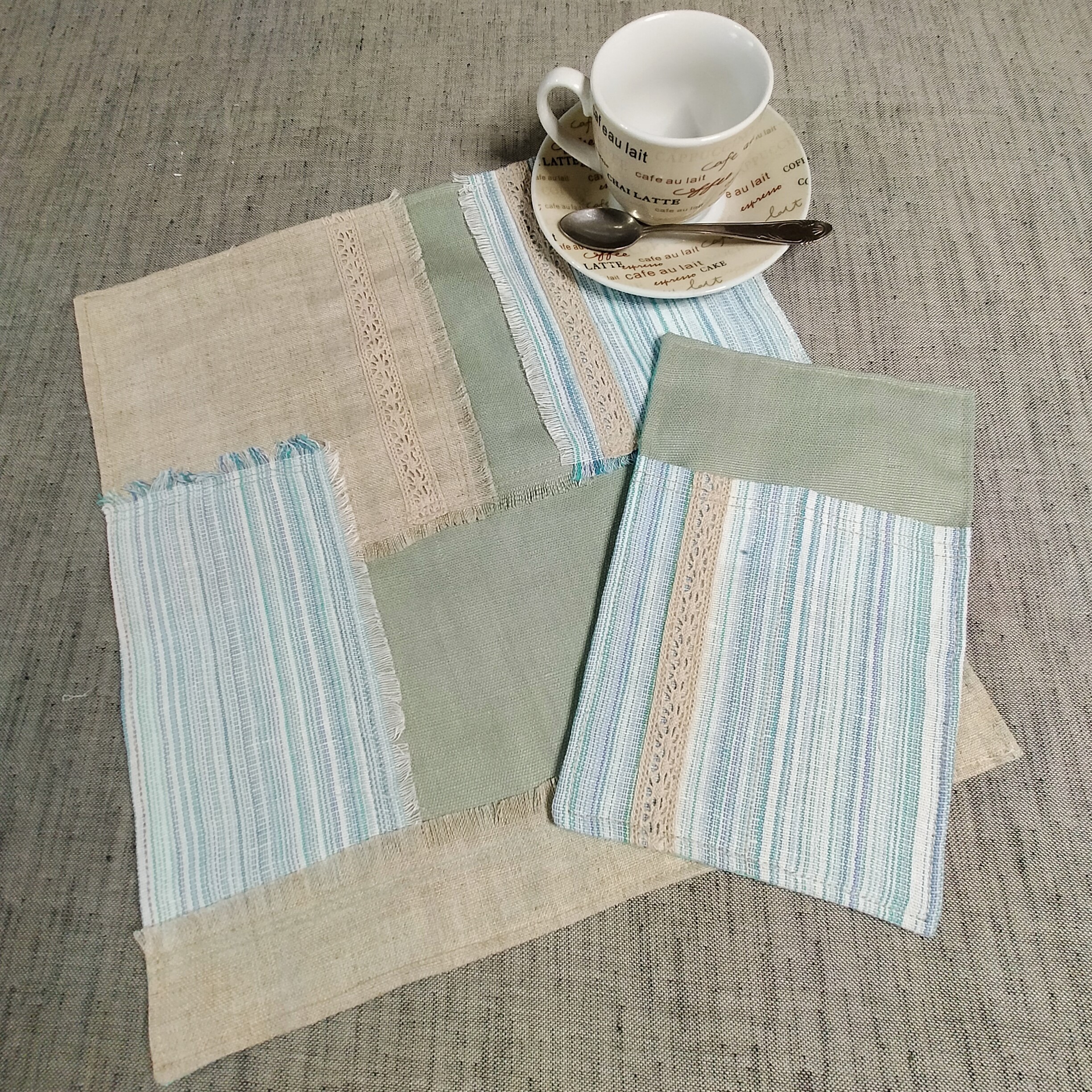 Набор для сервировки стола - салфетка и чехол для столовых приборов. Размер салфетки примерно 30*30 см. Набор выполнен из льна (бежевые и зеленые части) и полульна (цветная часть) и украшен льняной тесьмой. Обратная сторона из х/б ткани. В данном дизайне выполнено в единственном экземпляре. Посуда и предметы дизайна на фото не продается.