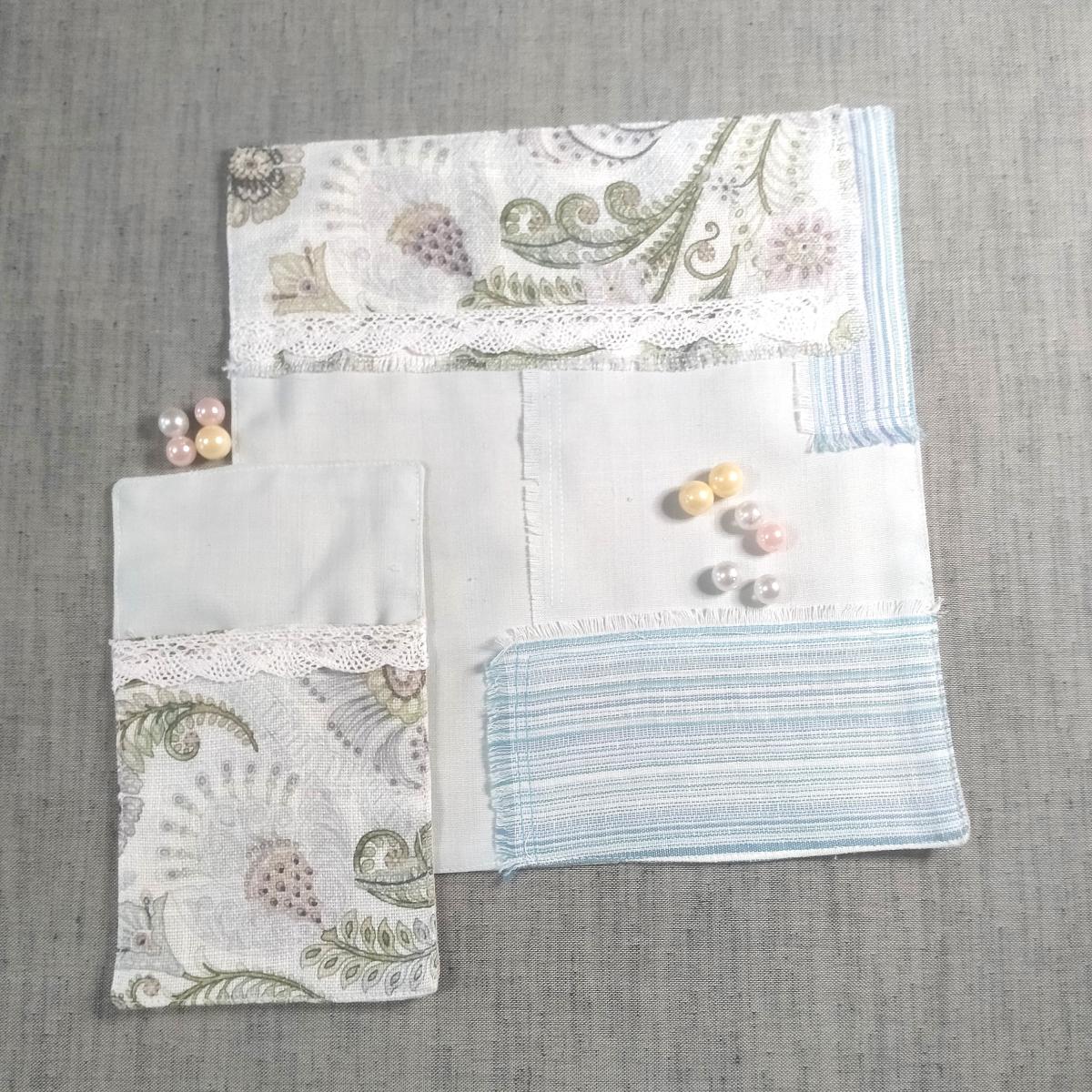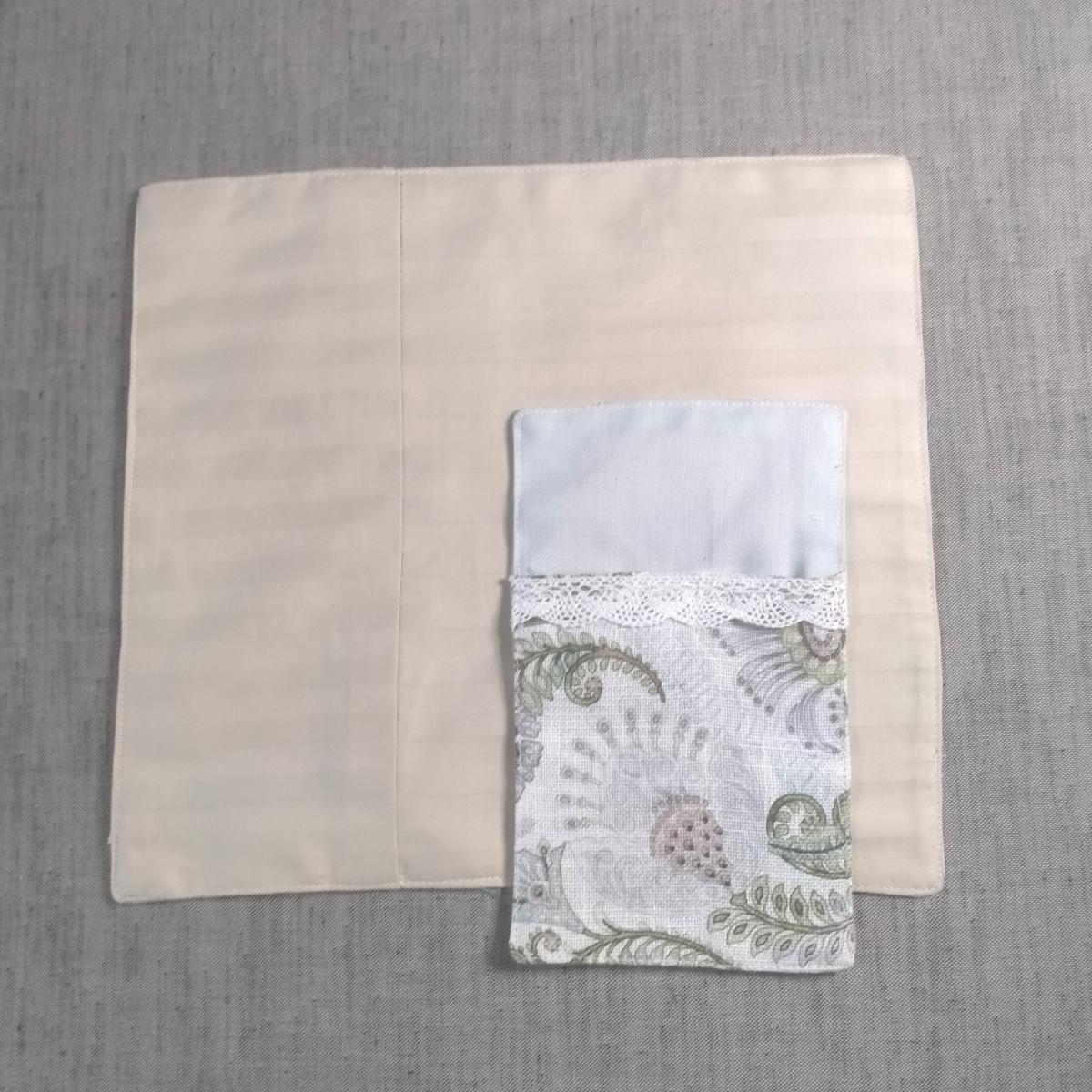Набор для сервировки стола - салфетка и чехол для столовых приборов. Размер салфетки примерно 30*30 см. Набор выполнен из льна (голубая часть), полульна (цветная полосатая часть) и рогожки (цветная часть с цветами) и украшен льняной тесьмой белого цвета. Обратная сторона из х/б ткани. В данном дизайне выполнено в единственном экземпляре. Посуда и предметы дизайна на фото не продаются.