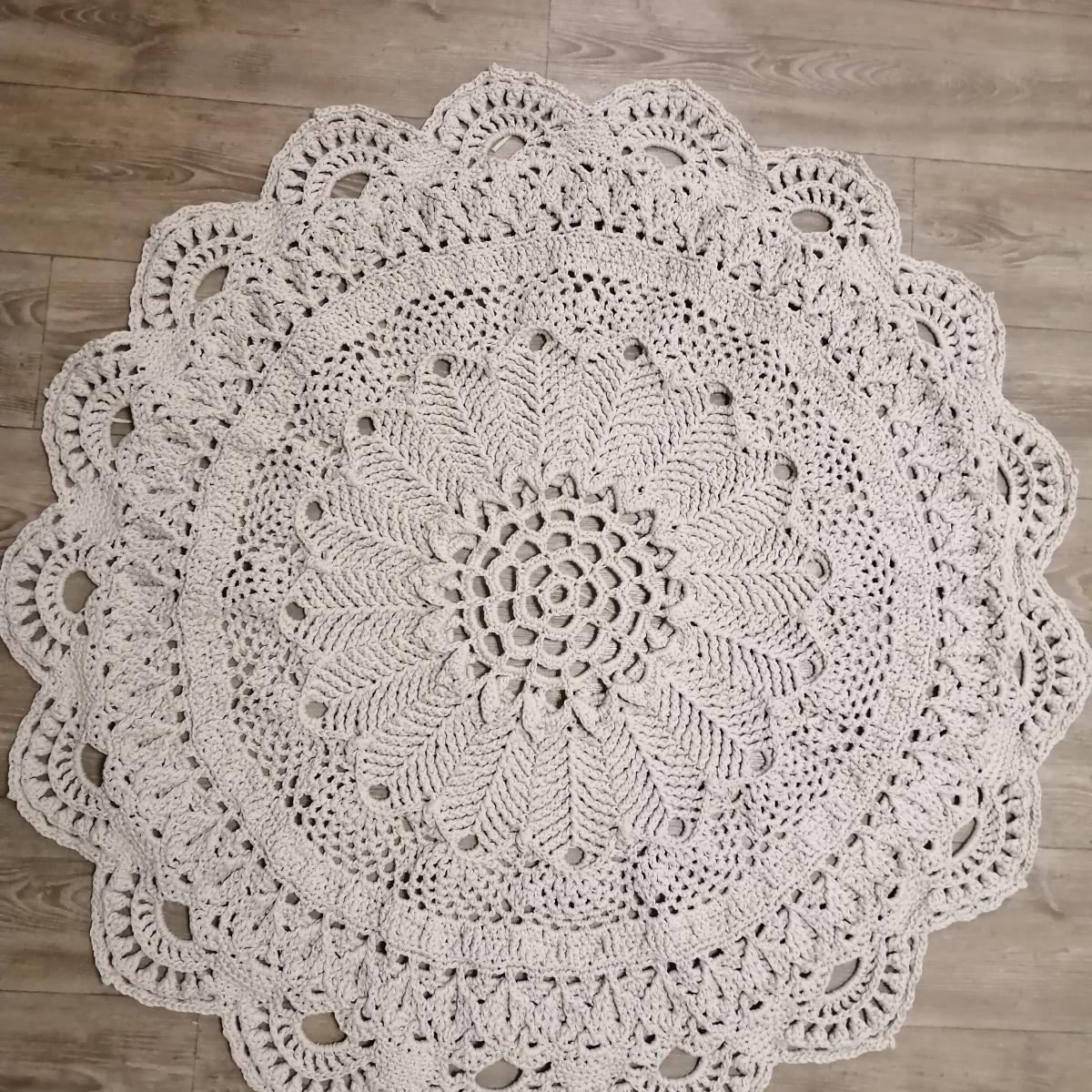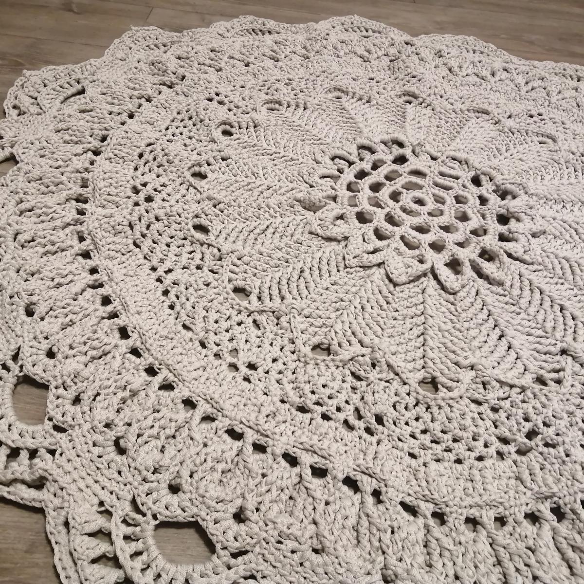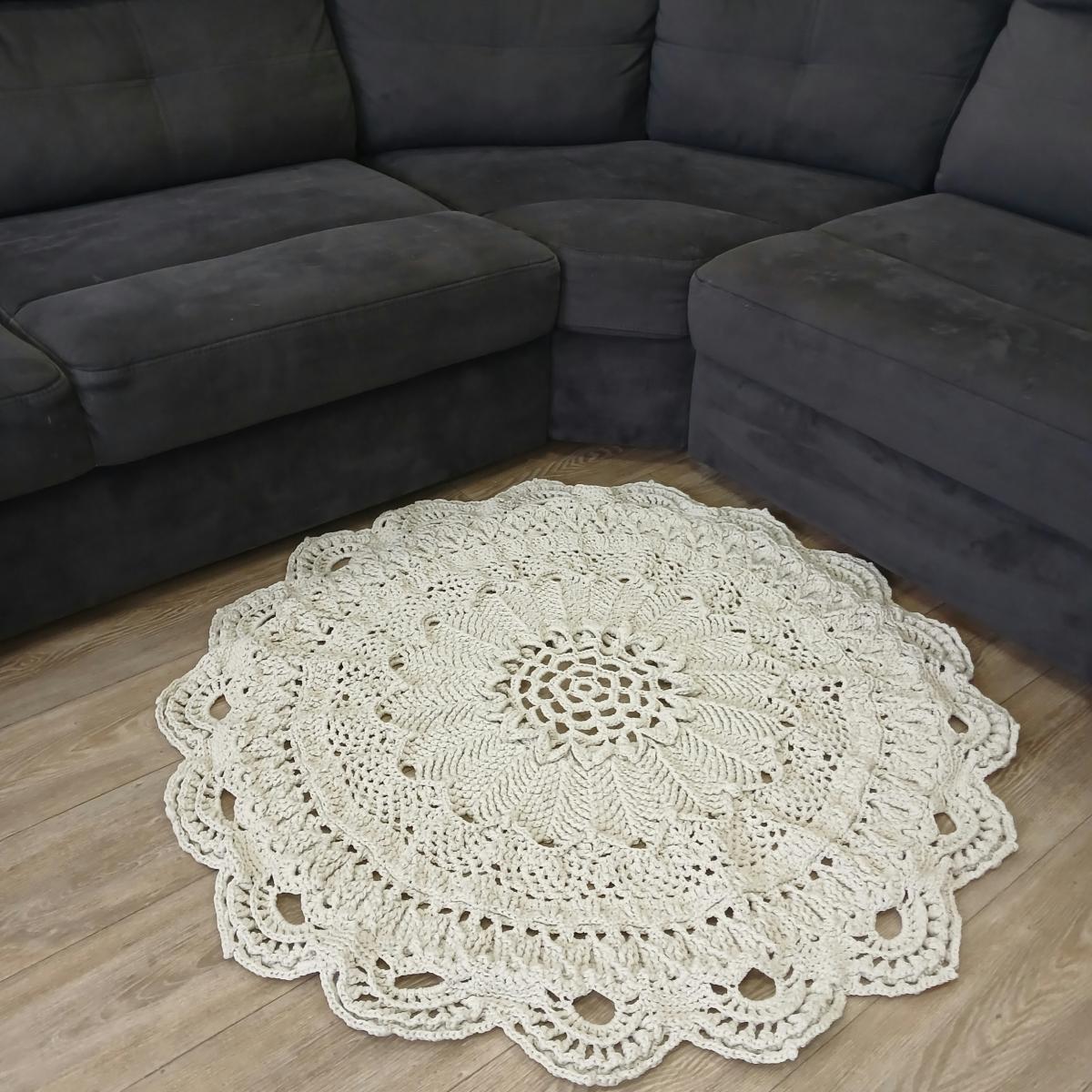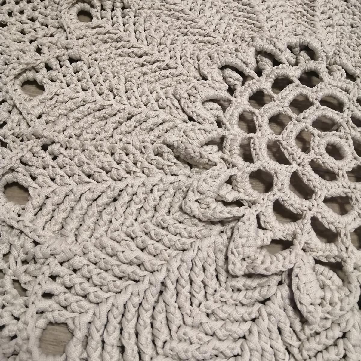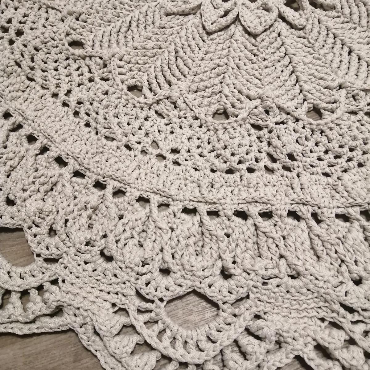 Ковер выполнен в технике вязания крючком из полиэфирного шнура. Он имеет сложный ажурный узор с центральным цветочным мотивом и волнистыми краями. Такой ковер станет отличным украшением интерьера, добавляя уют и стиль.