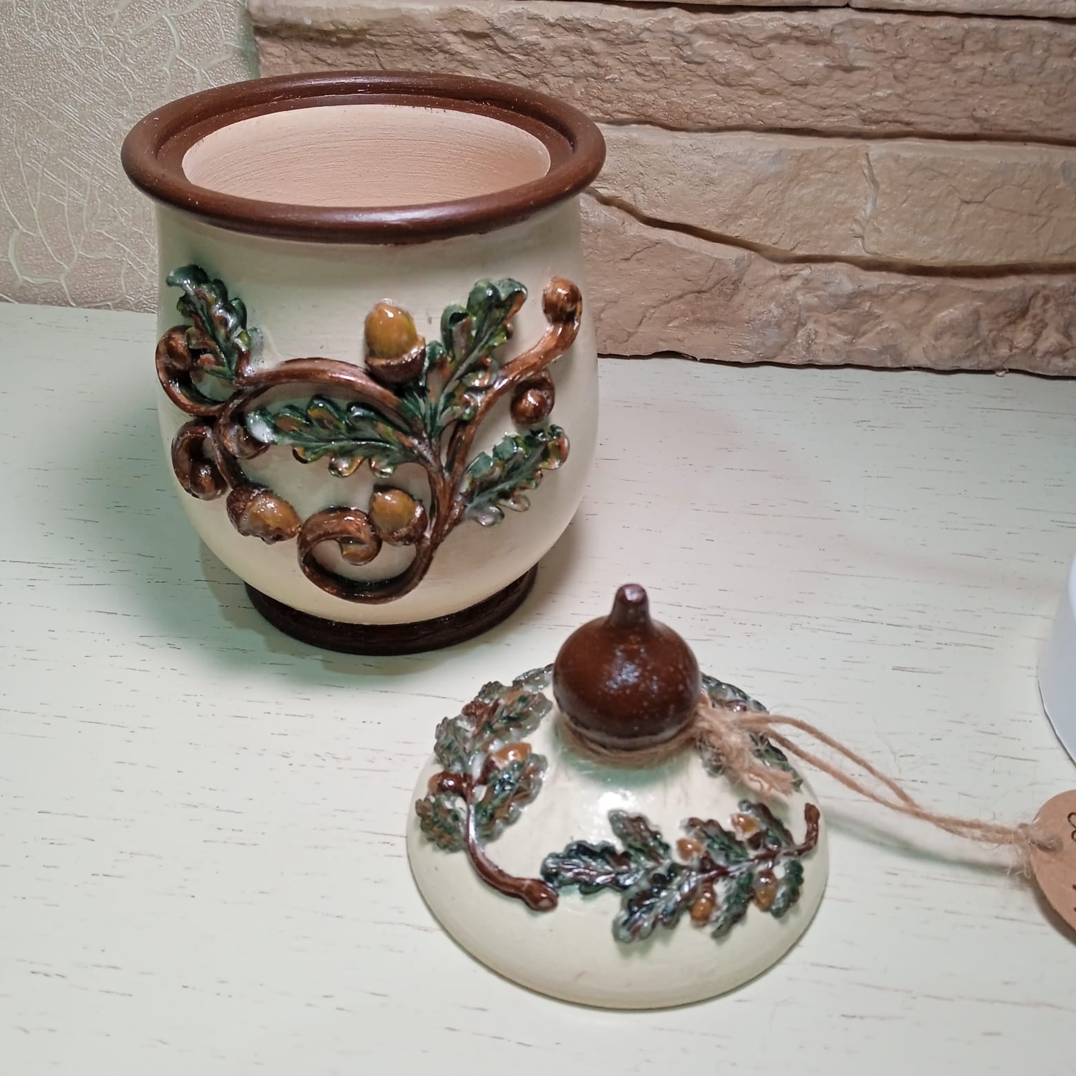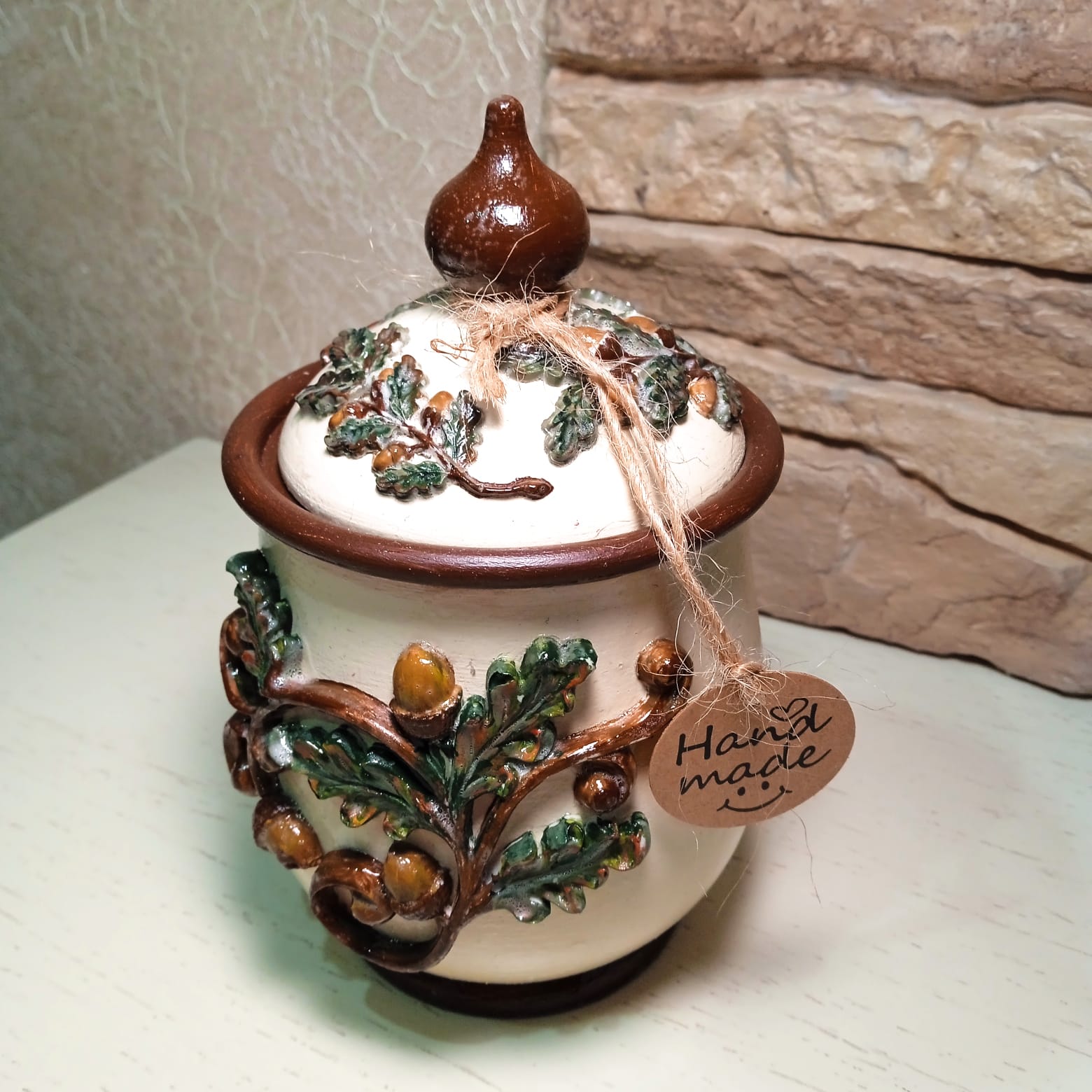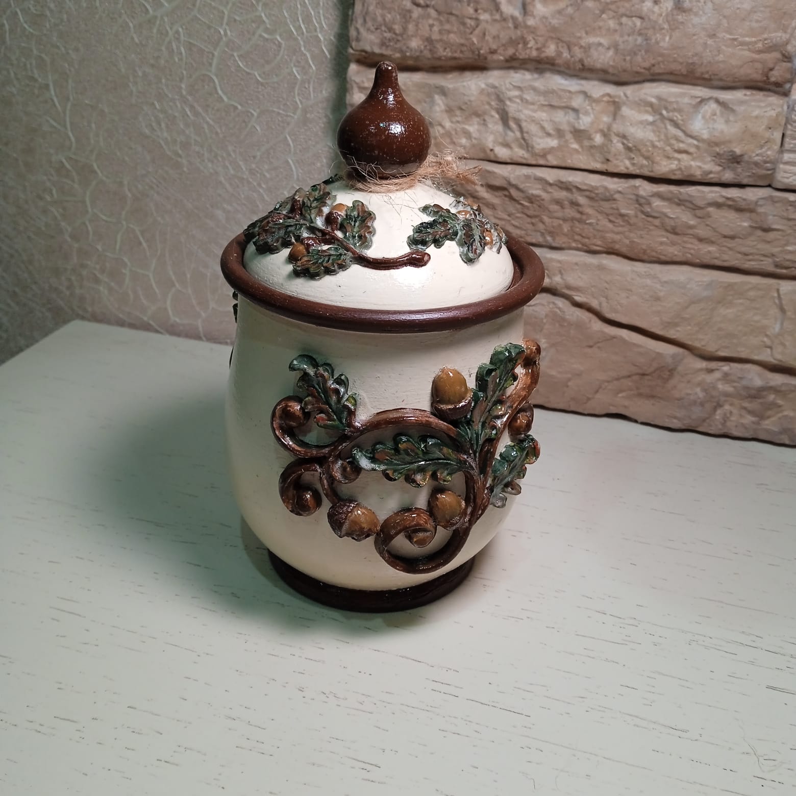 Баночка"Лесная сказка" для специй или других сыпучих продуктов, изготовлена из липы, выполнена медотом декупаж с обьемным рельефом. Внутри ничем не окрашена. Высота 15 см, диаметр 30 см. Ручная работа.