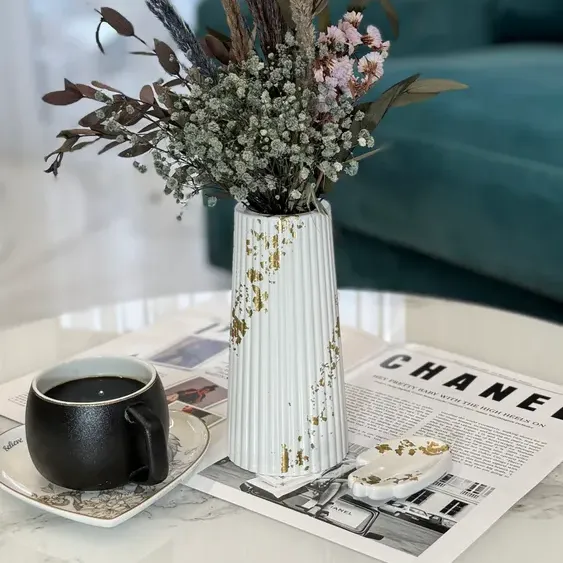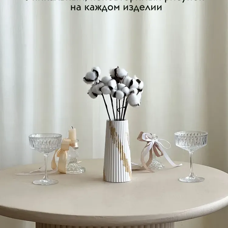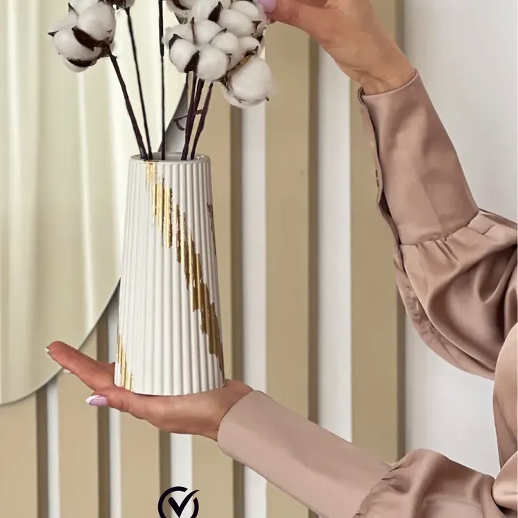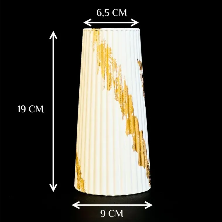 Ваза для сухоцветов, это не просто вазочка под цветы , это великолепная большая белая ваза для сухоцветов c золотыми элементами потали .Изготовлена из высокопрочного гипса, который является экологически безопасным материалом . Обработана защитным слоем премиального покрытия, которое придает глянцевый блеск изделию. . Форма конусообразная, ребристая рельефная, классический стиль. Размер по высоте средний (19см). Дно круглое, гладкое, не царапает поверхность мебели.