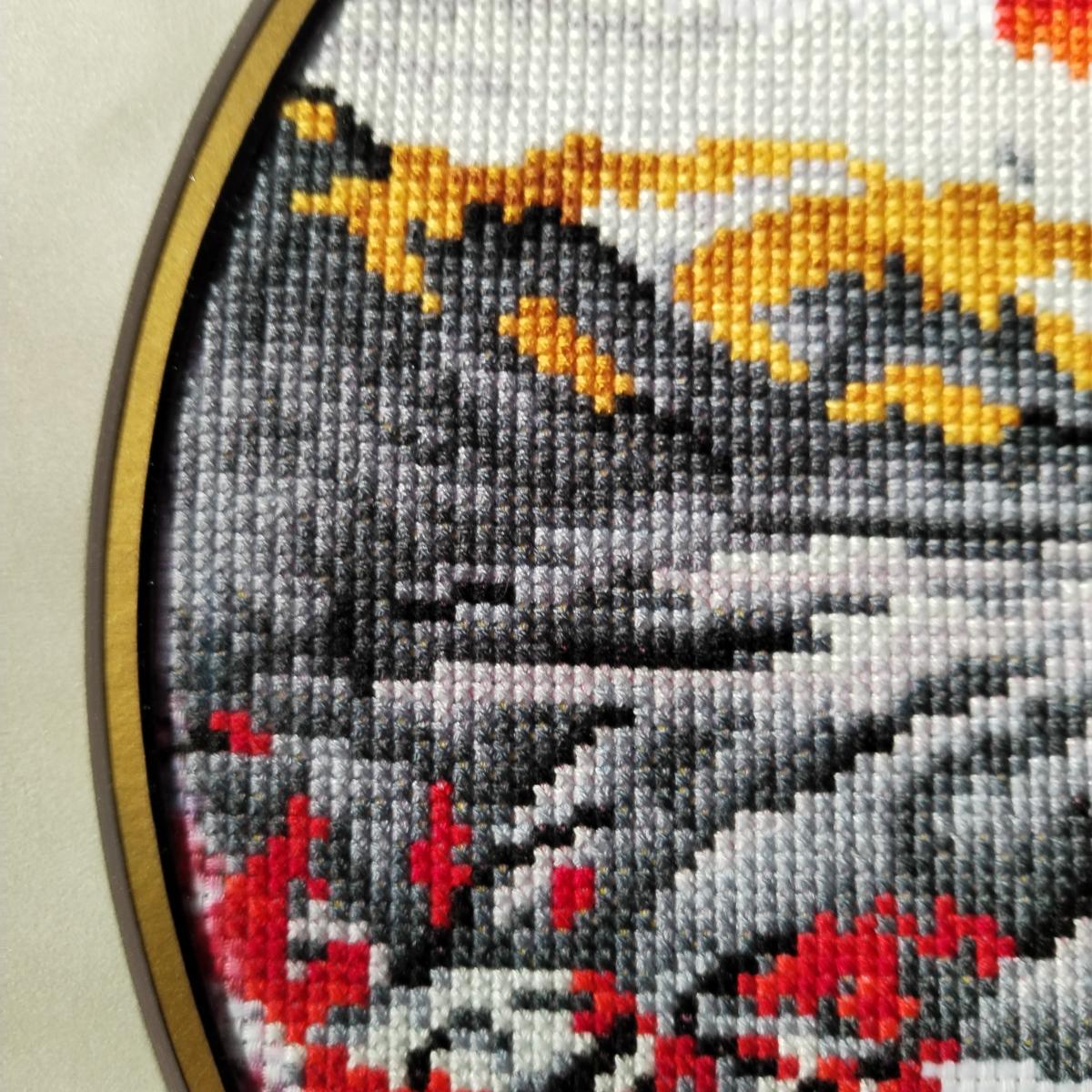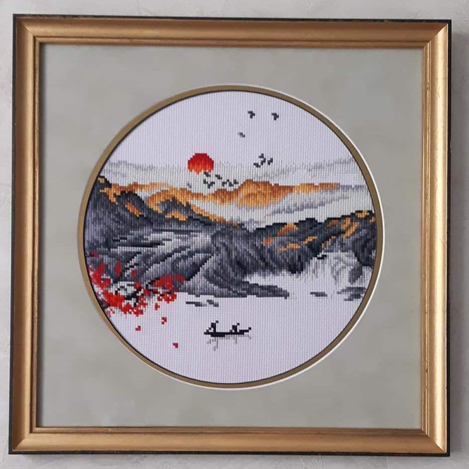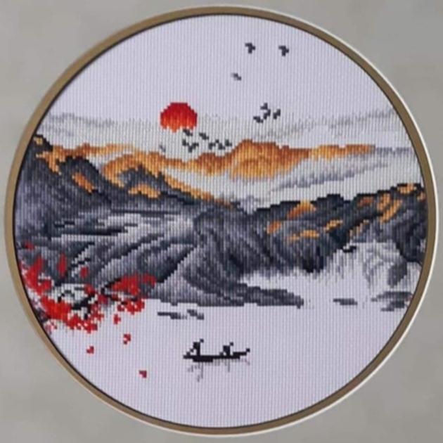 Вышитый крестом (частичная зашивка) осенний пейзаж в китайском стиле.