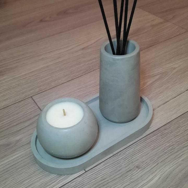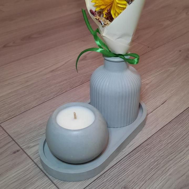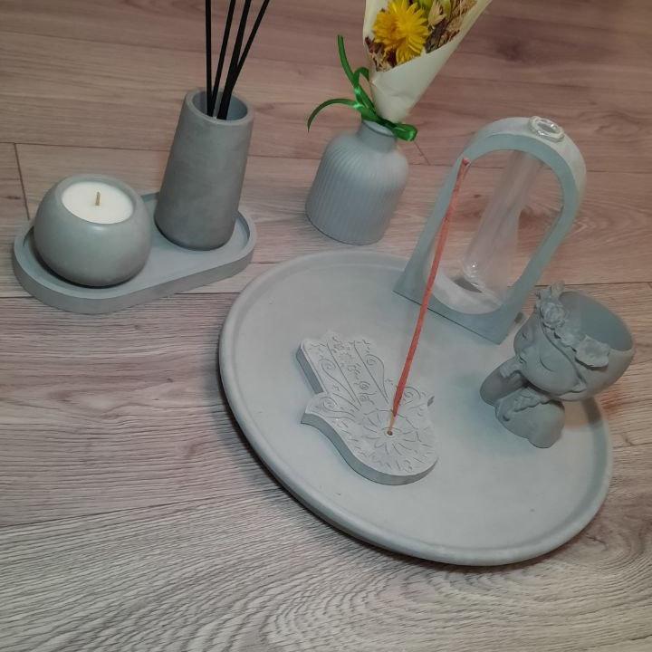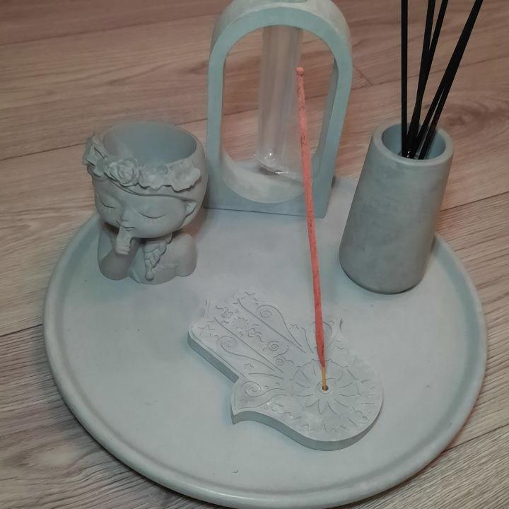В состав комплекта входит: большая, круглая подставка под всякую мелочь, маленькая подставка, кашпо, 2 вазы под деффузор или сухоцветы, ваза с колбой под срезанный цветок, подсвечник многоразовый, подставка под благовония, букет с сухоцветами, открытка, инструкция по уходу за гипсовыми изделиями.