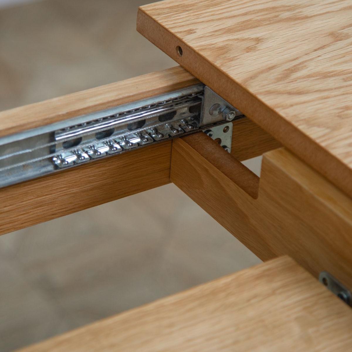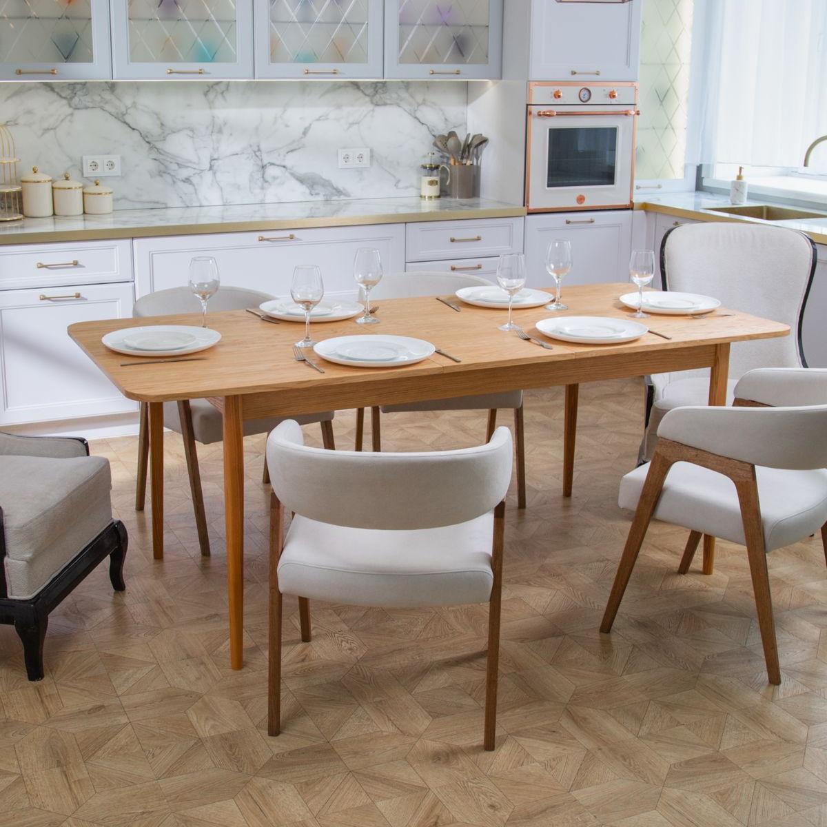 Столешница из МДФ с покрытием из натурального дубового шпона создает атмосферу тепла и уюта. Данный материал обеспечивает высокую устойчивость к внешним воздействиям и долговечность, а также придает изделию благородный вид. Ножки из массива ясеня обеспечат устойчивость на долгие годы. Надежная установка вставки достигается благодаря четырем фиксаторам. Прямоугольная форма столешницы позволяет удобно разместить посуду и сервировку, обеспечивая комфортное пространство для каждого.