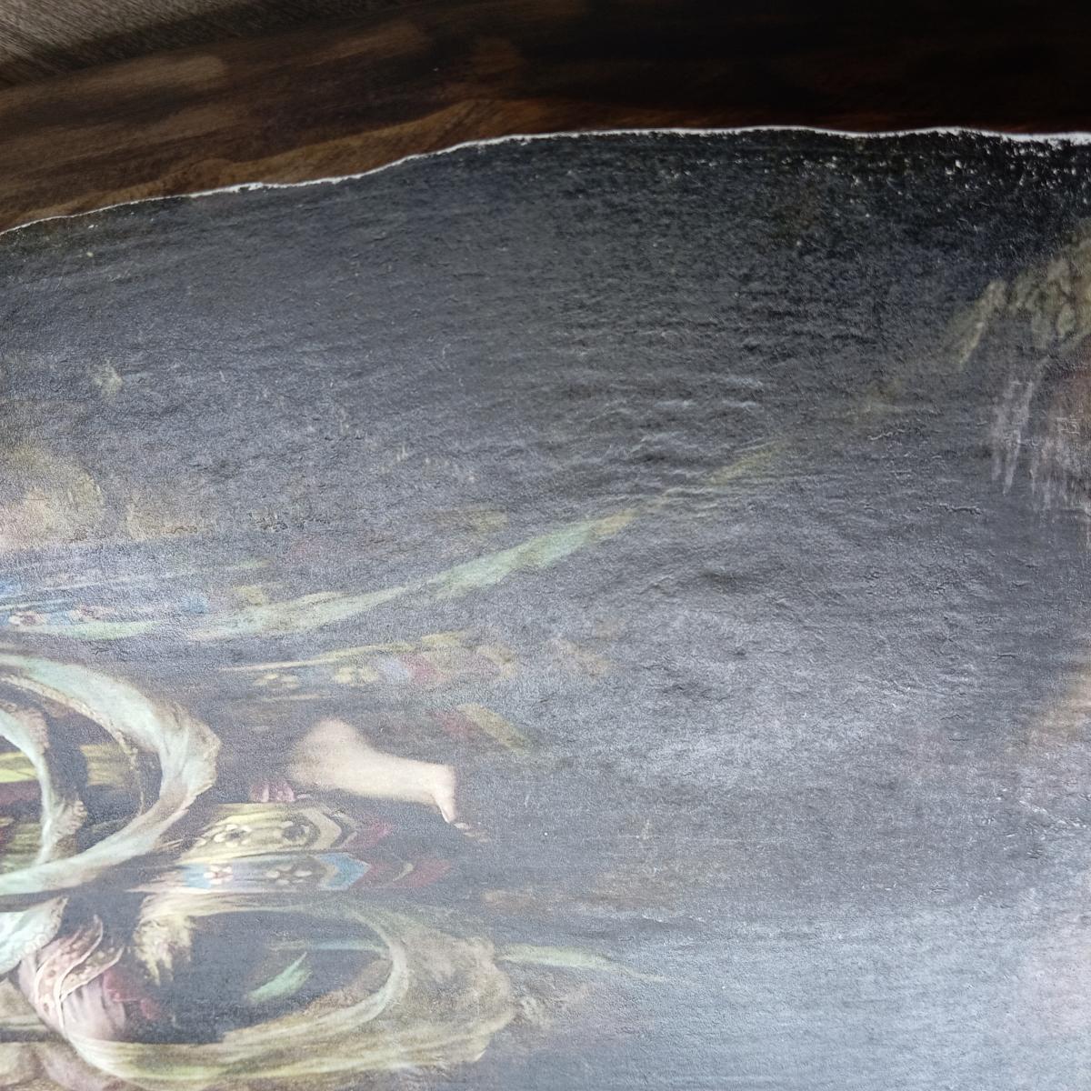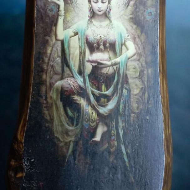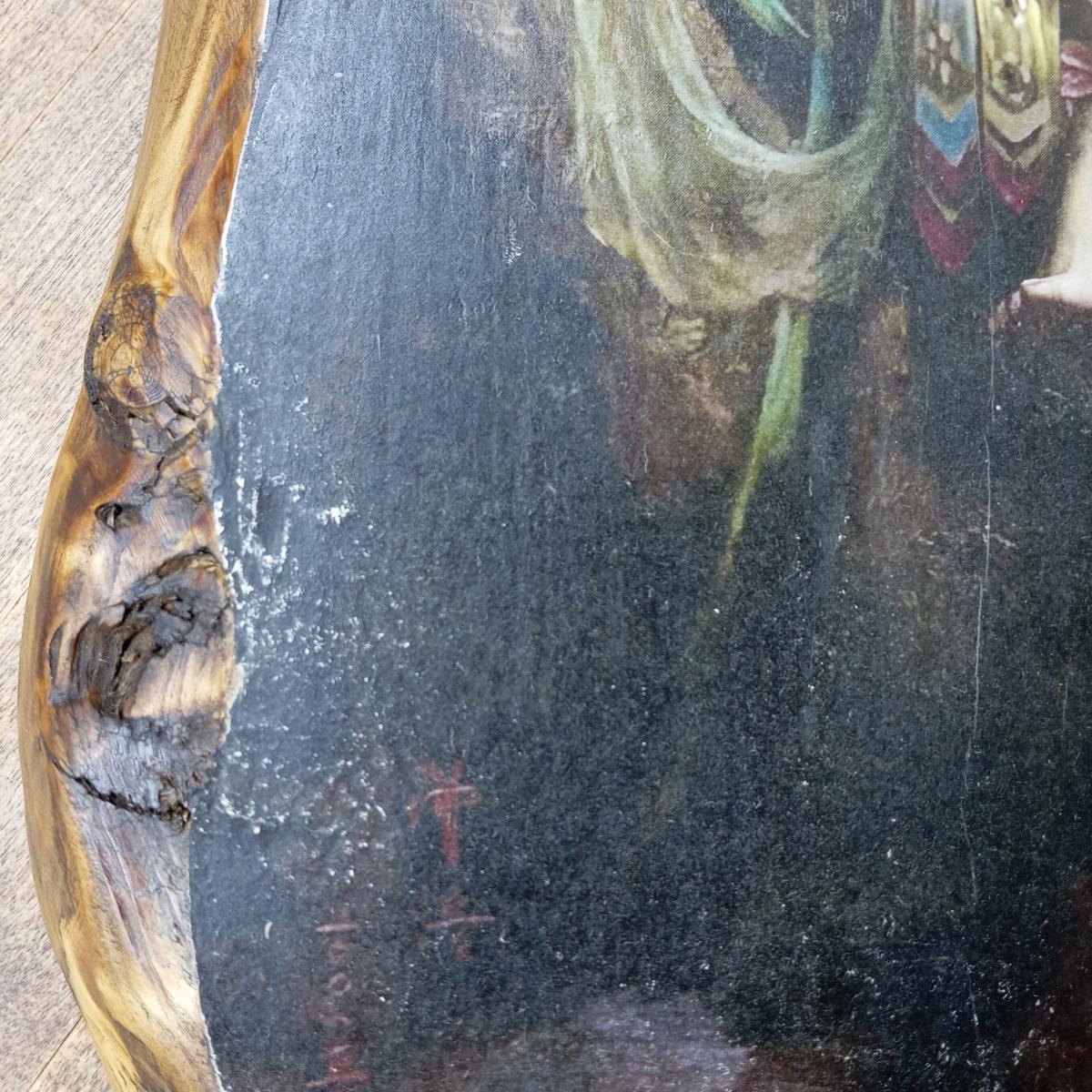 Данный образ выполнен на старинной сосновой доске. Техника вживление изображения, изображение деликатно состарено и покрыто маслом. очень красиво съедено короедом край доски.