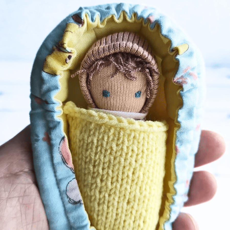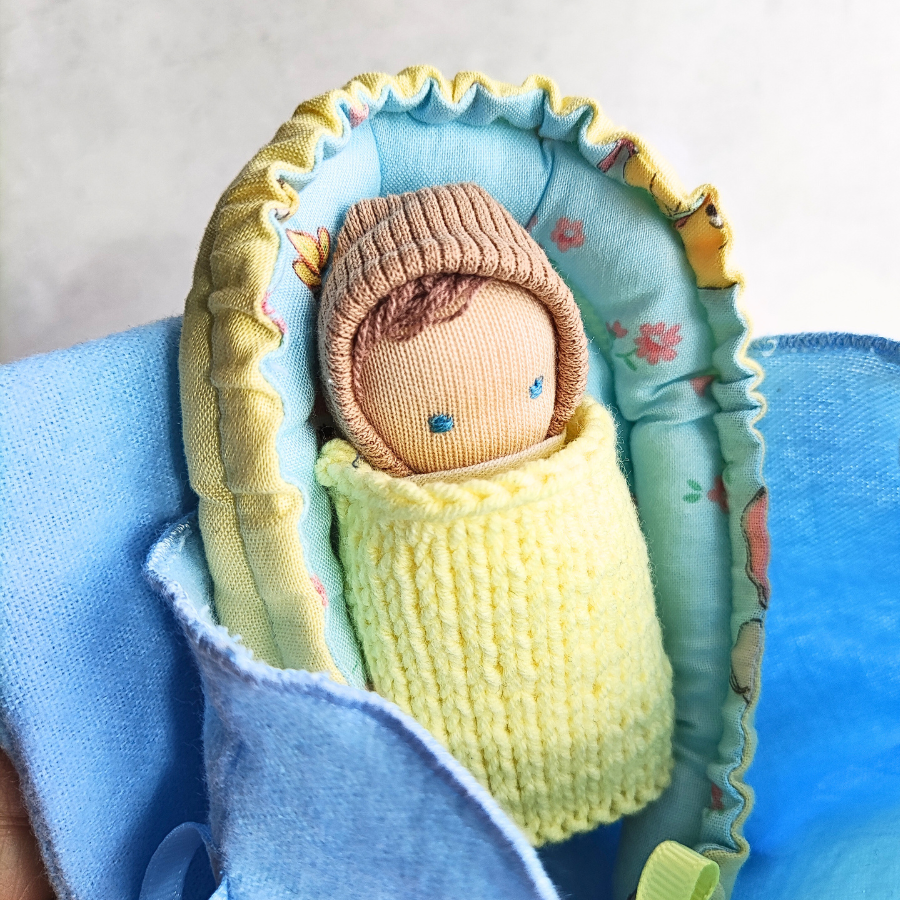 Крошка в ладошке сшита в стиле Вальдорфской игрушки, кокон двухсторонний, набит холлофайбером, одеяльце связано из х/б ниток, пеленка и шапочка у крошки пришиты к телу, не снимаются. В комплект входит фланелевый мешочек.