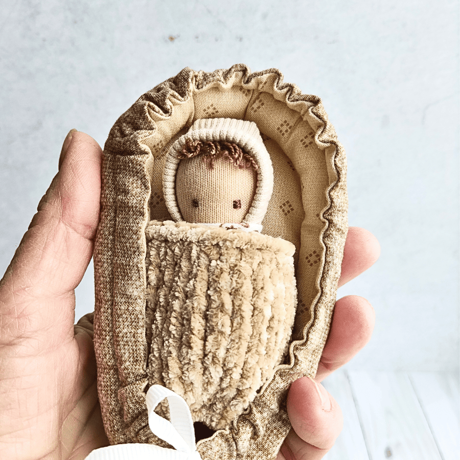 Наша куколка приятна на ощуп, благодаря использованию мягких и текстурных материалов. Ребенок  чувствует различные текстуры, формы и вес куколки, что способствует развитию его сенсорных навыков.