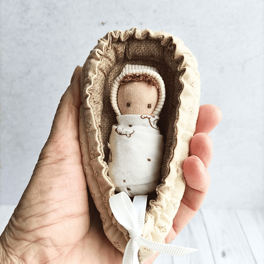 Крошка в ладошке сшита в стиле Вальдорфской игрушки, кокон двухсторонний, набит холлофайбером, одеяльце связано из х/б ниток, пеленка и шапочка у крошки пришиты к телу, не снимаются. В комплект входит фланелевый мешочек.
