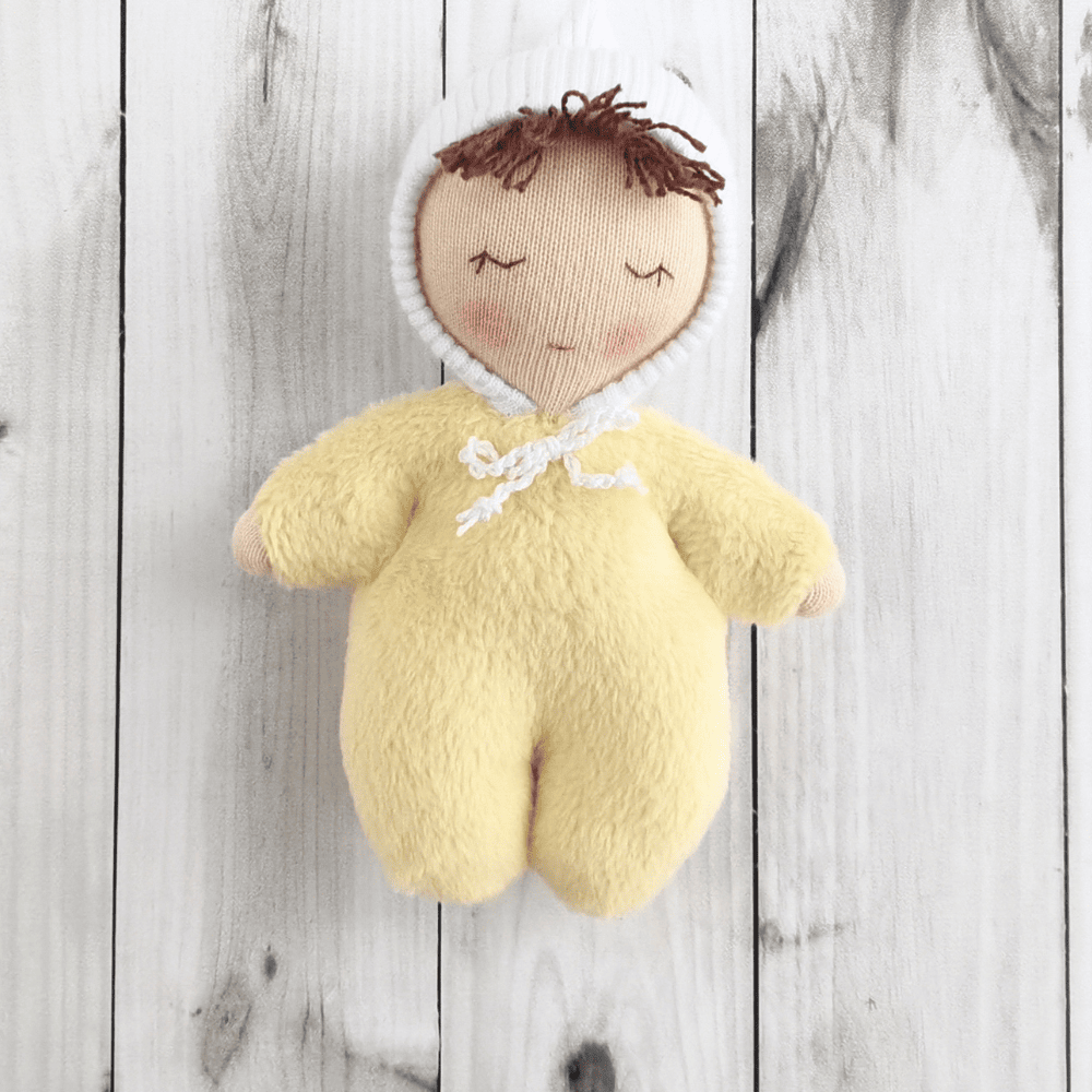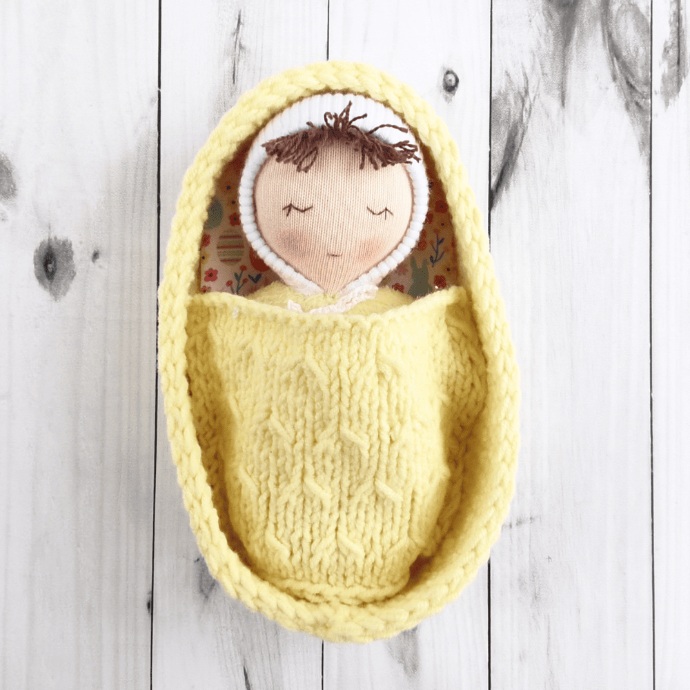 Ляля в колыбельке выполнена в лимонном цвете, приятная на ощупь, пластична, сшита по мотивам вальдорфской куклы.