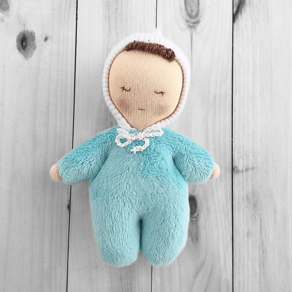 Ляля в колыбельке выполнена в нежно бирюзовом цвете, приятная на ощупь, пластична, сшита по мотивам вальдорфской куклы