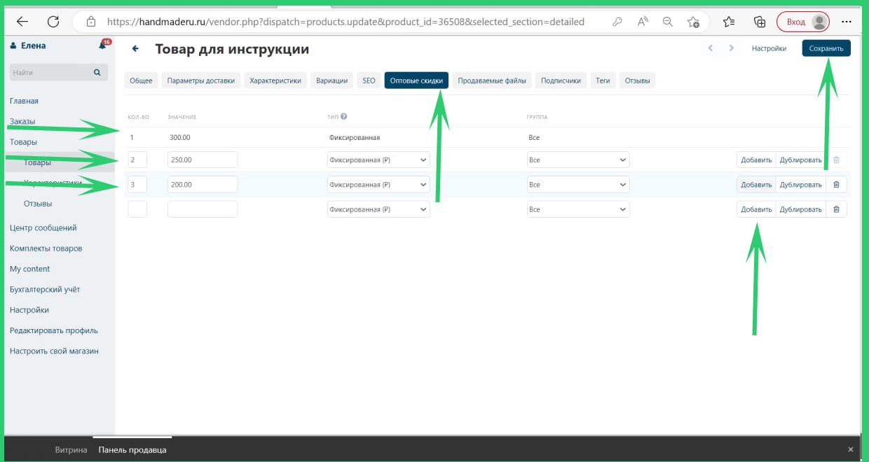 Как заполнять-например, цена товара в розницу единицы товара 300 рублей, при покупке от 2 штук цена 250 рублей за штуку, от 3 штук 200 рублей.