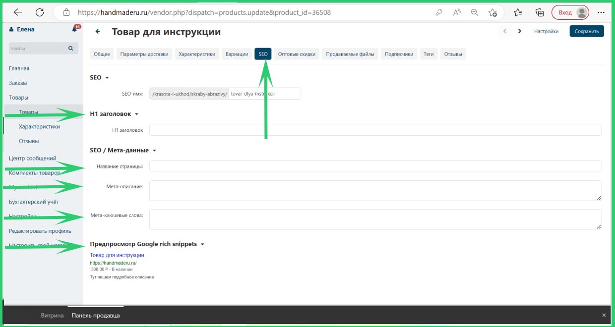 Как будет отображаться сниппет на ваш товар в поиске гугл и яндекс, прочитайте под словами: Предпросмотр Google rich snippets