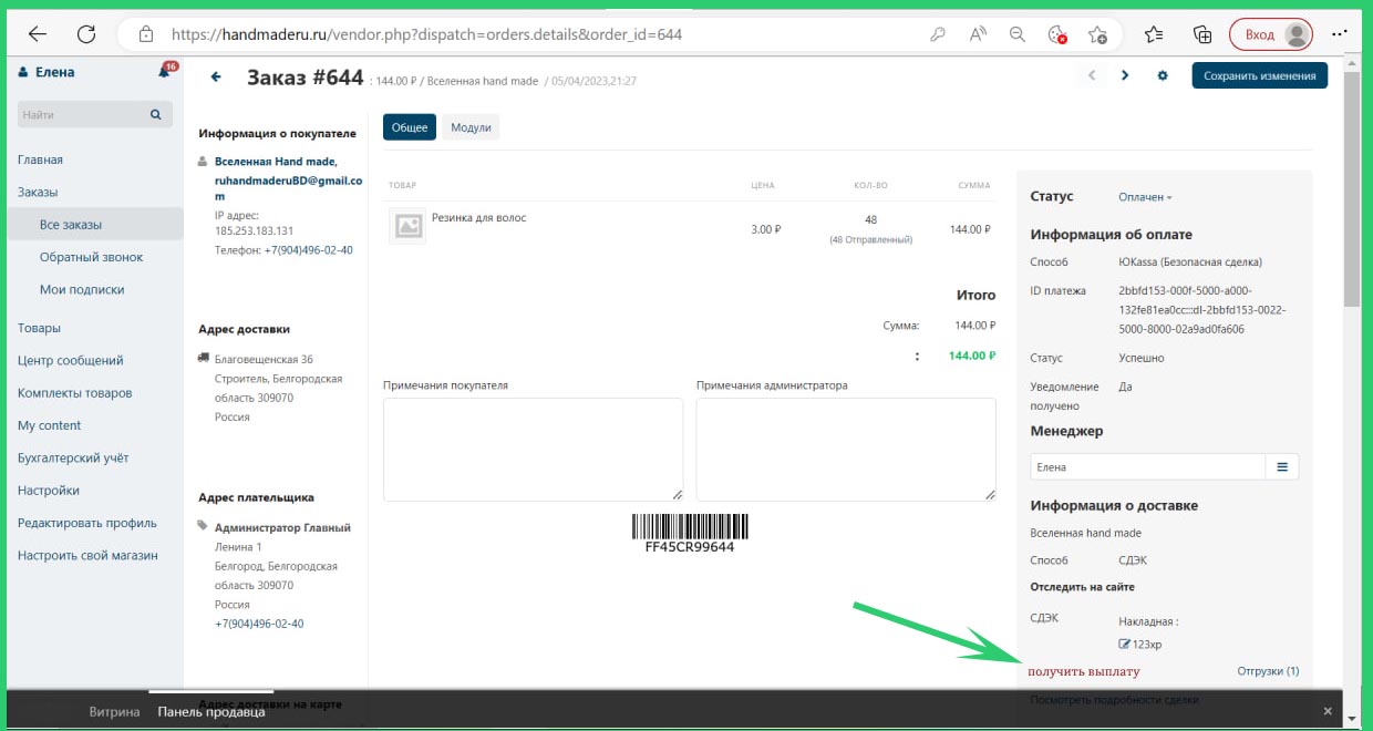 Отправка заказа и получение выплаты