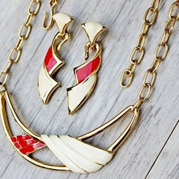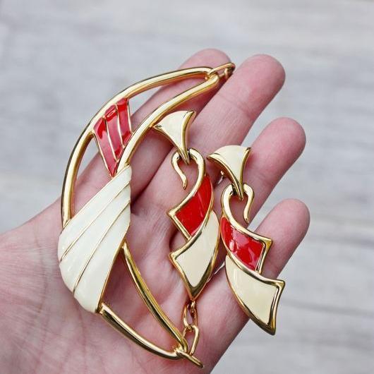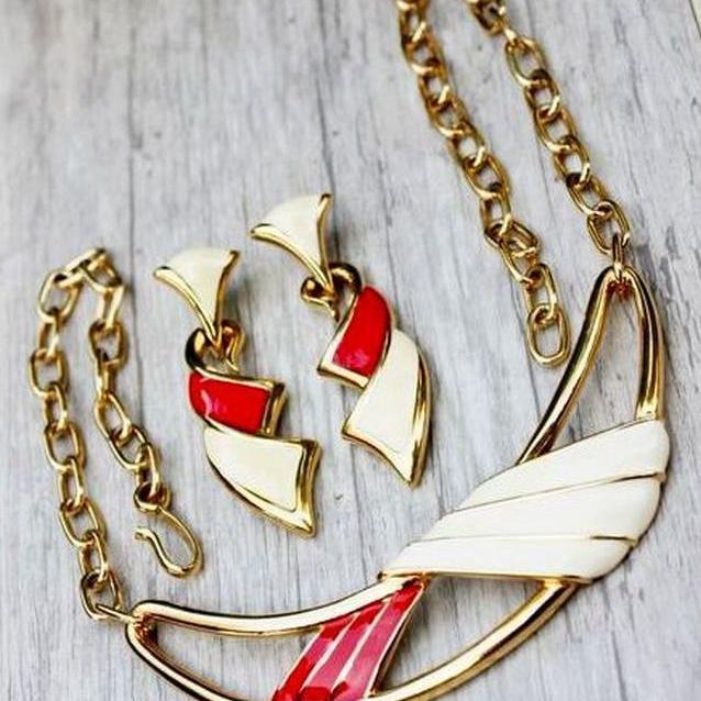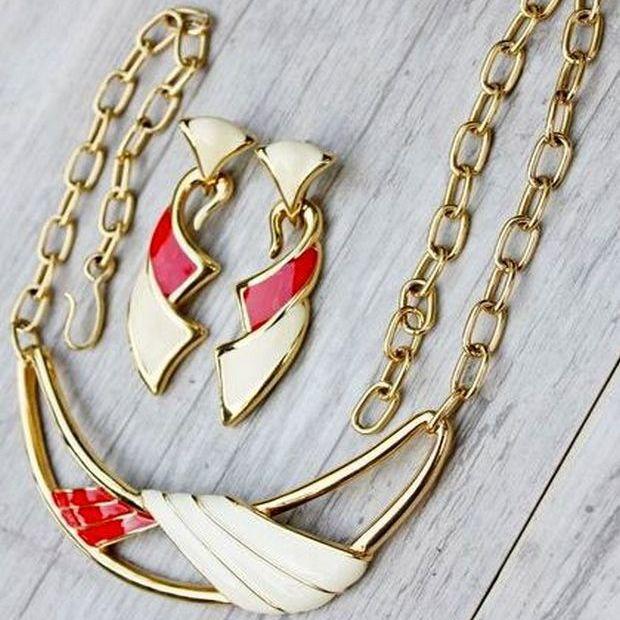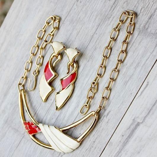 Яркий и стильный комплект, колье и серьги ( для проколотых ушей), 1960-х годов,от компании Monet. Изготовлен из ювелирного сплава золотого тона и эмали. Маркированы и колье, и серьги, Monet со знаком копирайта. Отличное состояние. Украшения Monet, всегда отличаются интересным дизайном и высоким качеством исполнения.