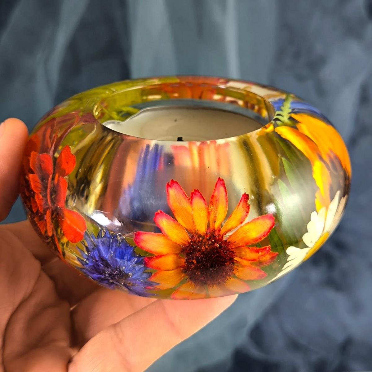 Изготовлен из высушенных особым способом растений и эпоксидной смолы. Это изделие приятно держать в руках, а эффект преломления добавляет изюминку.