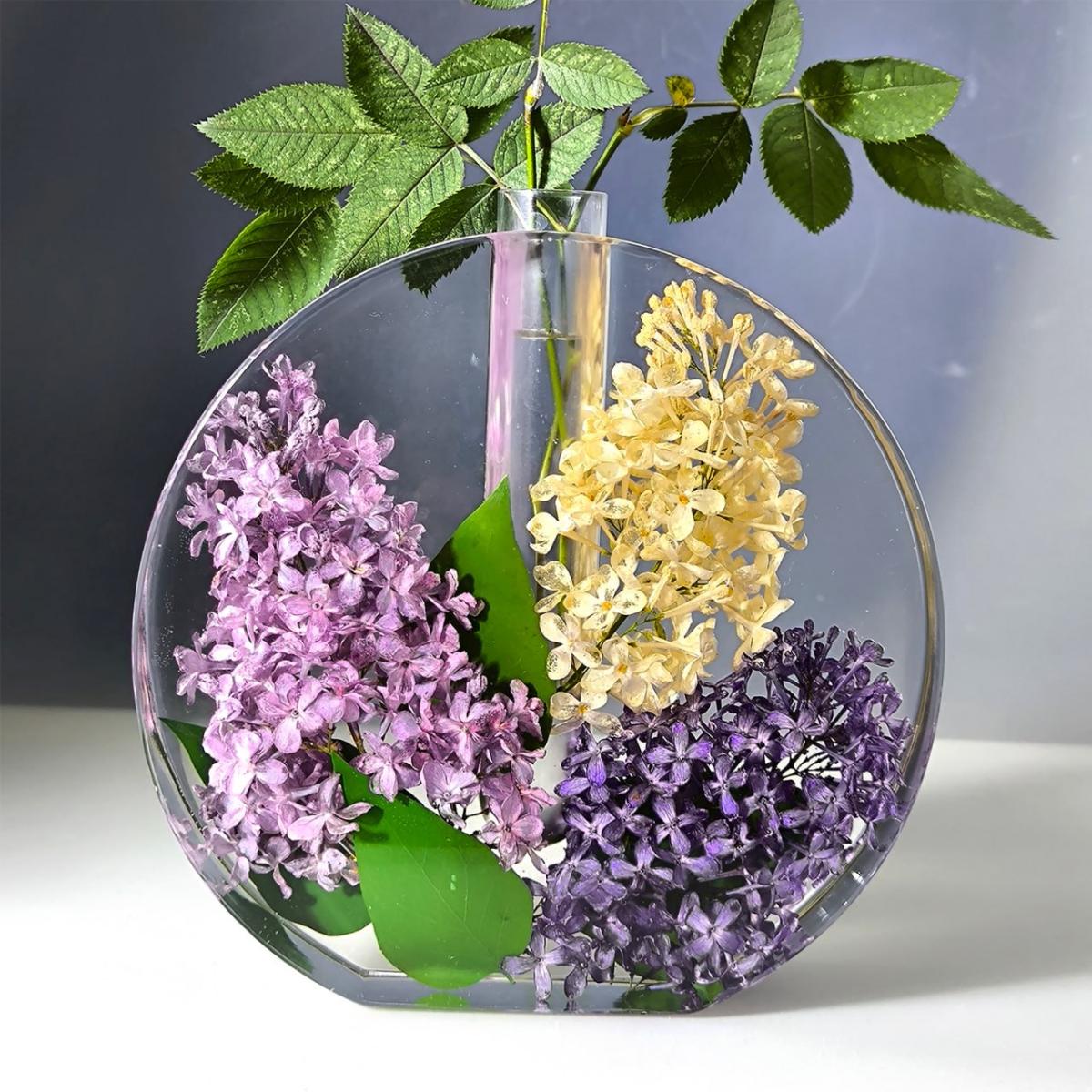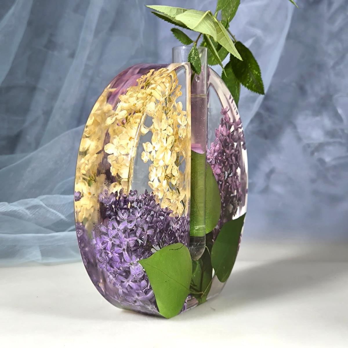 Ваза с колбой для одного цветка с настоящей сиренью внутри. Ваза выполнена из высушенных цветов сирени и прозрачной эпоксидной смолы.