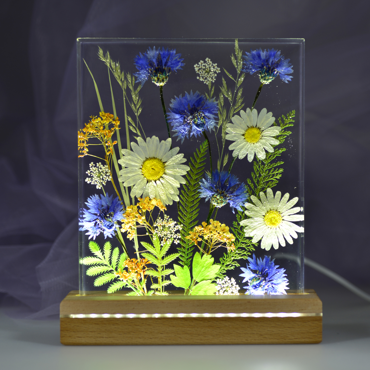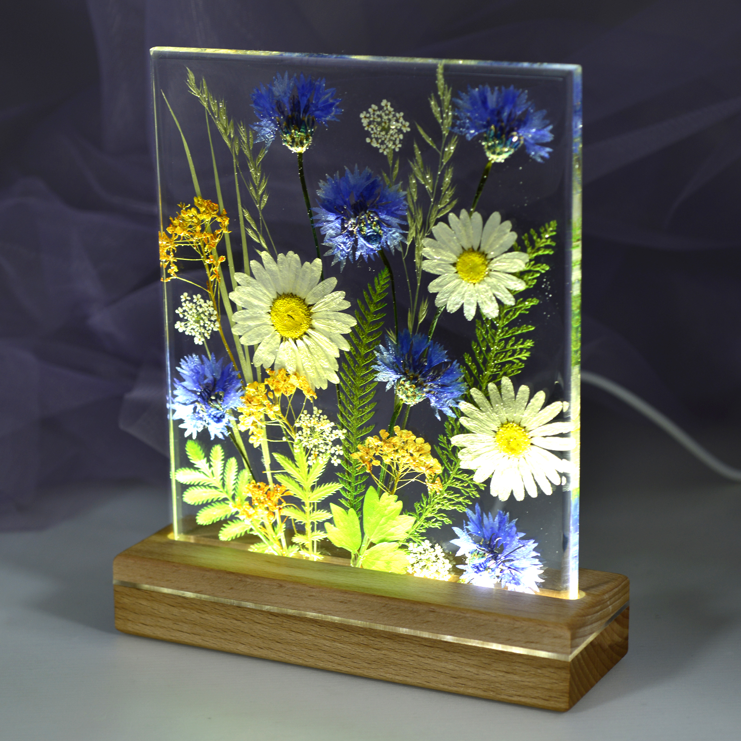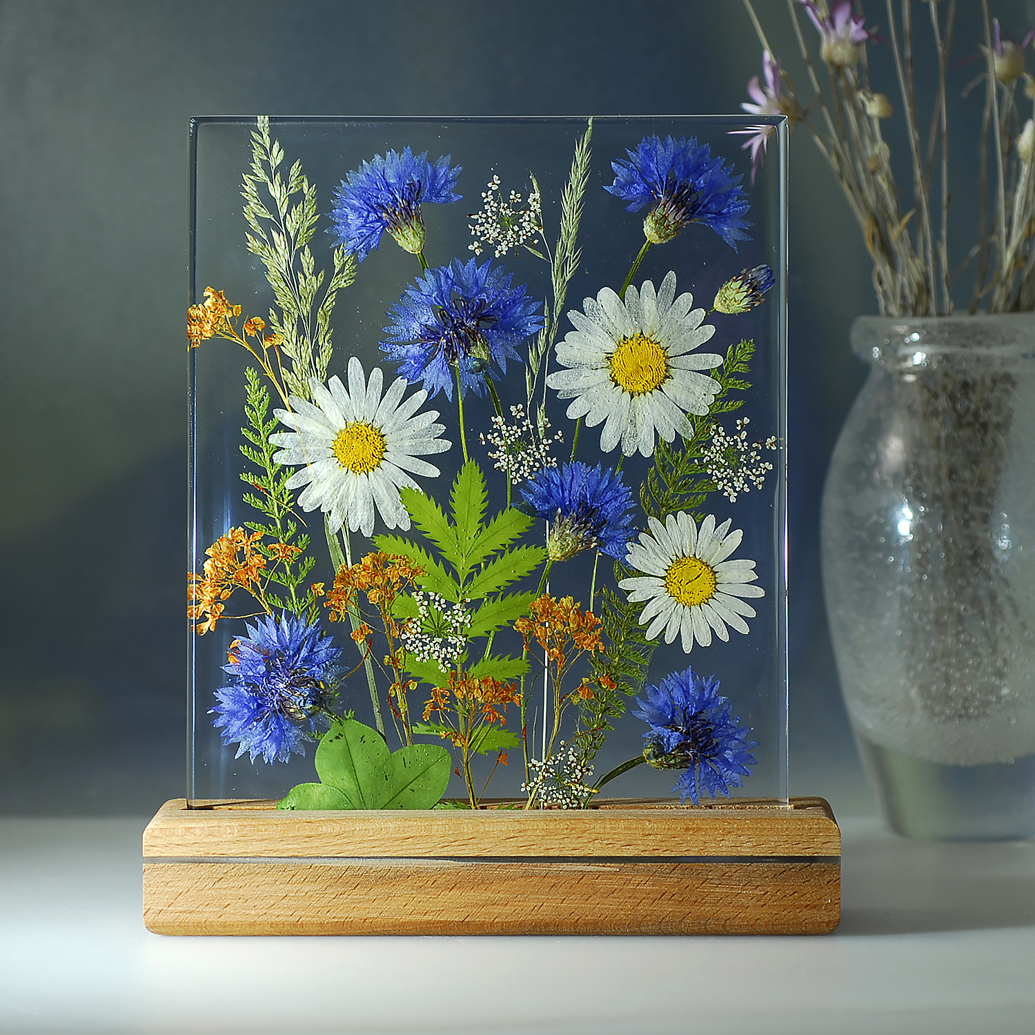 Витраж из эпоксидной смолы и натуральных цветов на деревянной подставке со светодиодами.