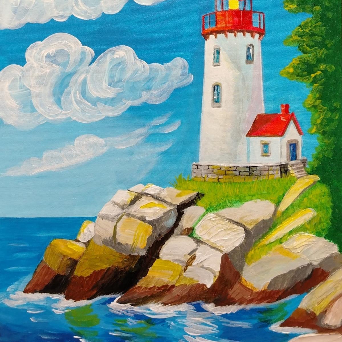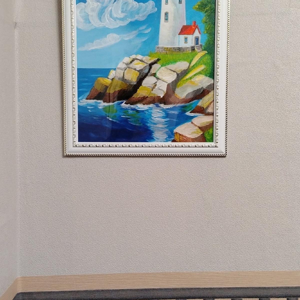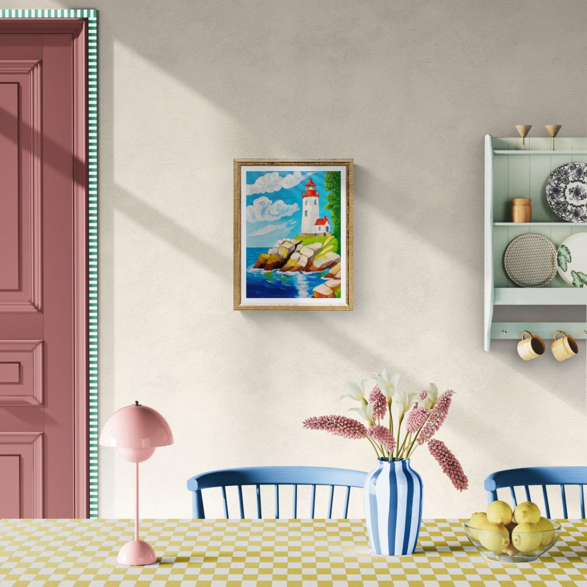 На картине изображен маяк, стоящий на скалистом берегу. Он выполнен в ярких и насыщенных цветах, что придает ему особую выразительность. Маяк имеет белую основу и красную крышу, что делает его заметным на фоне голубого неба и моря. Вокруг маяка видны зеленые деревья и кустарники, а также каменные ступени, ведущие к нему. Помимо акриловых красок, для объема камней использована текстурная паста .Картина передает атмосферу спокойствия и умиротворения, характерную для морских пейзажей. Картина помещена в белую раму. Размер холста 40 см высота и 30 см ширина.