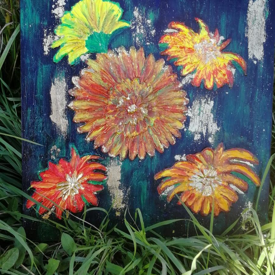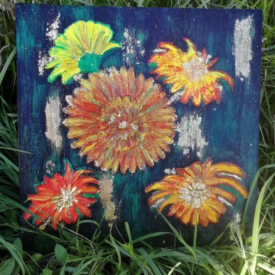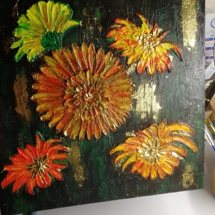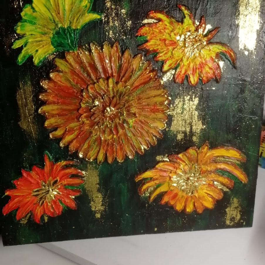 Представляю вашему вниманию уникальное произведение искусства, выполненное на холсте размером 30 на 30 см. Картина "Осенние цветы" выполнена в насыщенных золотых тонах с использованием шпатлевки, акриловых красок и потали для создания объемного эффекта. Яркие акценты цветов и текстуры создают атмосферу уюта и вдохновения. Эта работа станет ярким акцентом вашего интерьера или оригинальным подарком.