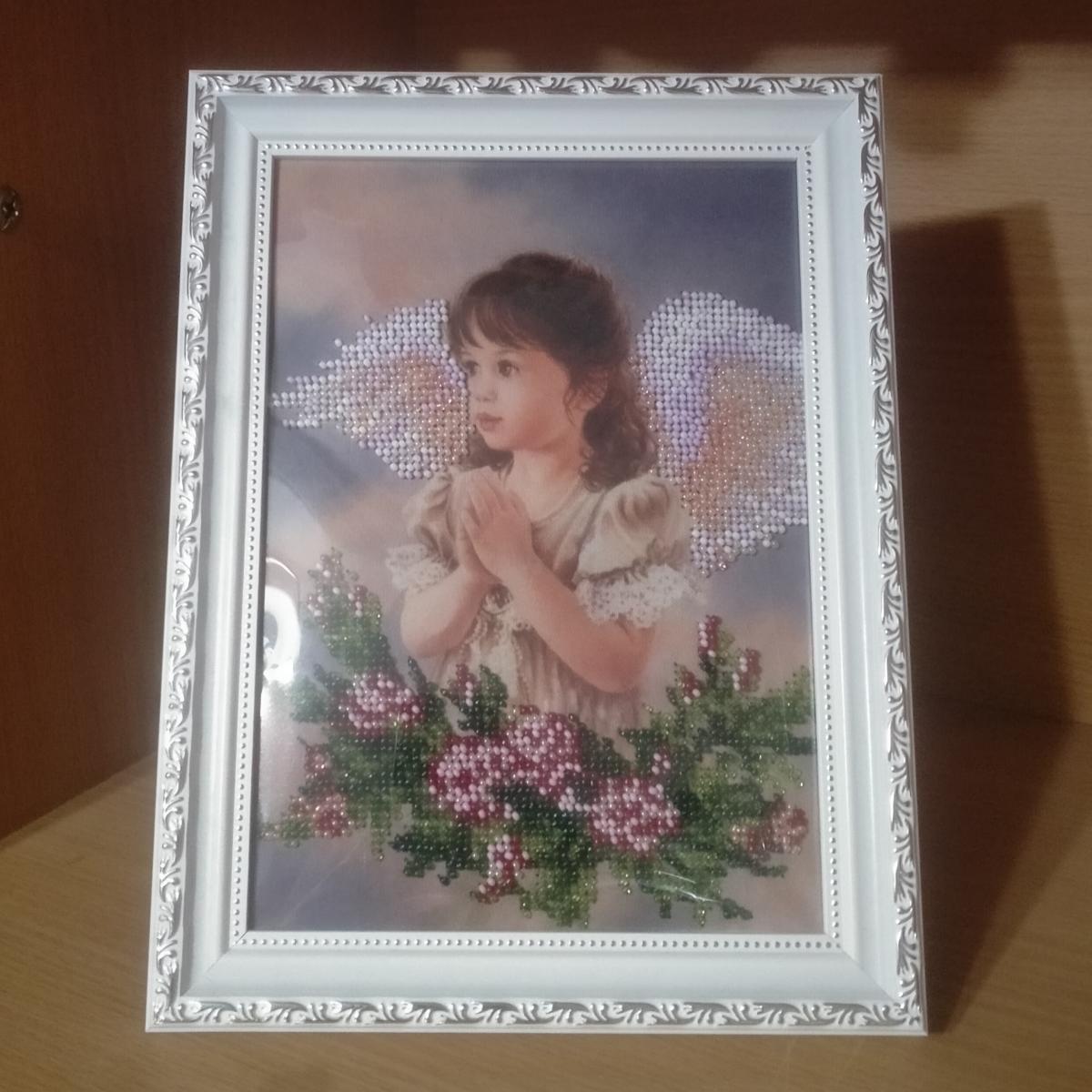 Картина "Ангелочек в розах", вышита бисером. Частичная вышивка. Размер изображения 14*20, размер рамы 19*25. Рама пластик, изображение закрыто оргстеклом. Цвет на фото более тусклый, чем в реальности. Рама с подставкой.
