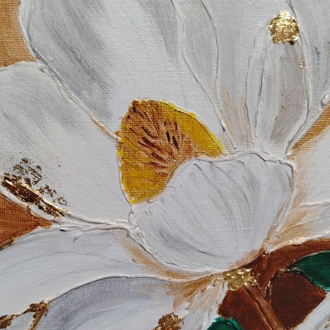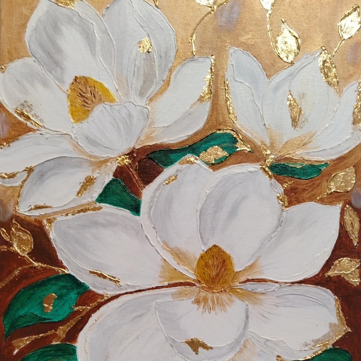 На картине изображены цветы, выполненные в смешанной технике с использованием акриловых красок, текстурной пасты и потали. Фон картины выполнен в золотистом цвете, что создает контраст с белыми цветами. Листья и стебли цветов покрыты текстурной пастой, что придает им объем и текстуру. В центре картины находится крупный цветок, который также покрыт текстурной пастой, что создает эффект глубины и объема. Картина выполнена на холсте, что придает ей дополнительную прочность и устойчивость. Картина станет прекрасным дополнением вашего интерьера в гостинной или детской комнатах.
