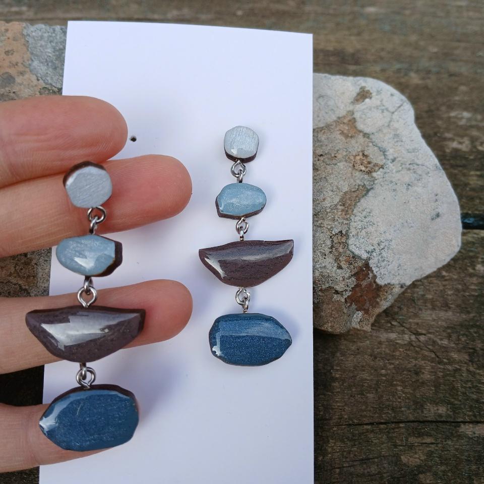 Серьги выполнены вручную из натурального дерева толщиной 0,4 мм. Каждый экземпляр имеет авторский дизайн, роспись, сделанную художником, и покрыт защитной ювелирной смолой, что создаёт иллюзию стеклянной поверхности