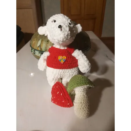 Замечательный мишка связанный из плюшевого материала, мягкий с красной одеждой с сердечком.