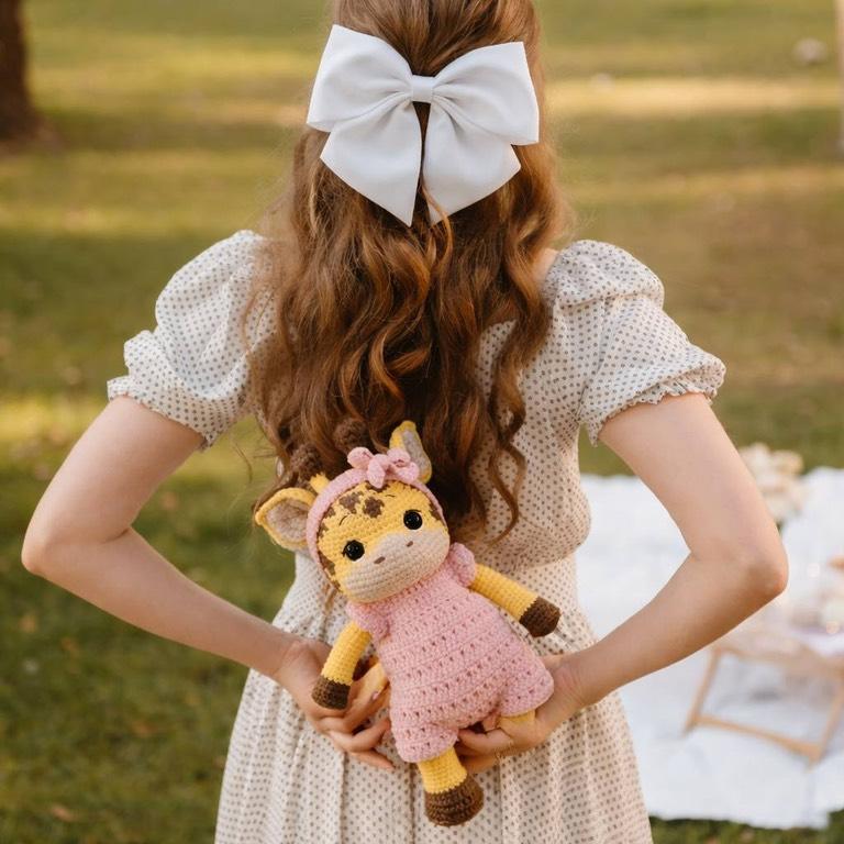 Платье и декоративные элементы аккуратно связаны и дополняют образ, делая его завершённым и эстетичным.