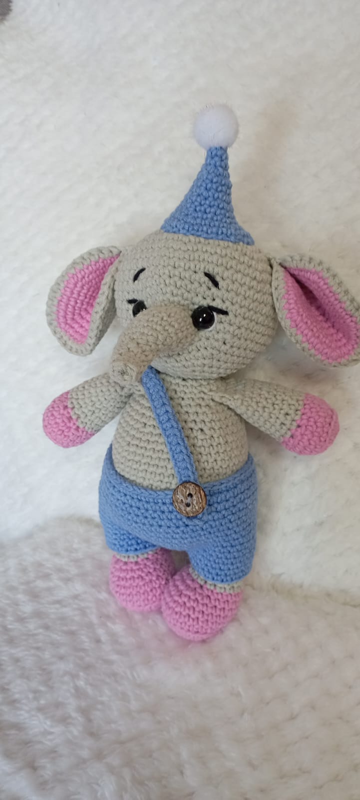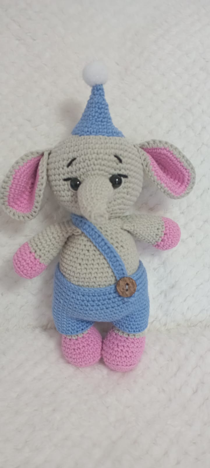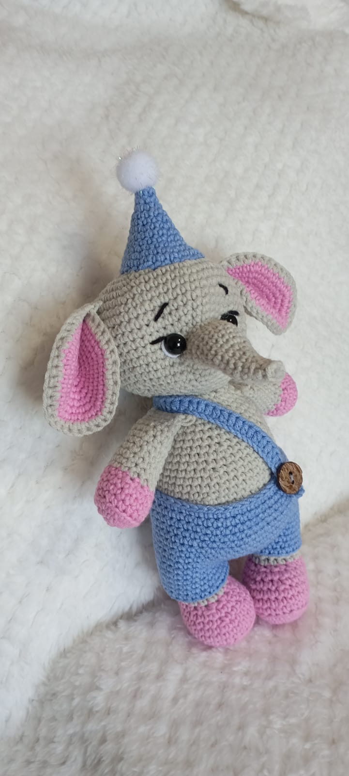 Слоник выполнен в нежных серых тонах с розовыми вставками на ушках и лапках. Он одет в милые голубые штанишки на пуговице и голубую шапочку с белым помпоном. Игрушка идеально подходит для подарка детям или в качестве декоративного элемента в интерьере. Изготовлено из качественной пряжи, гипоаллергенный и безопасный для малышей.