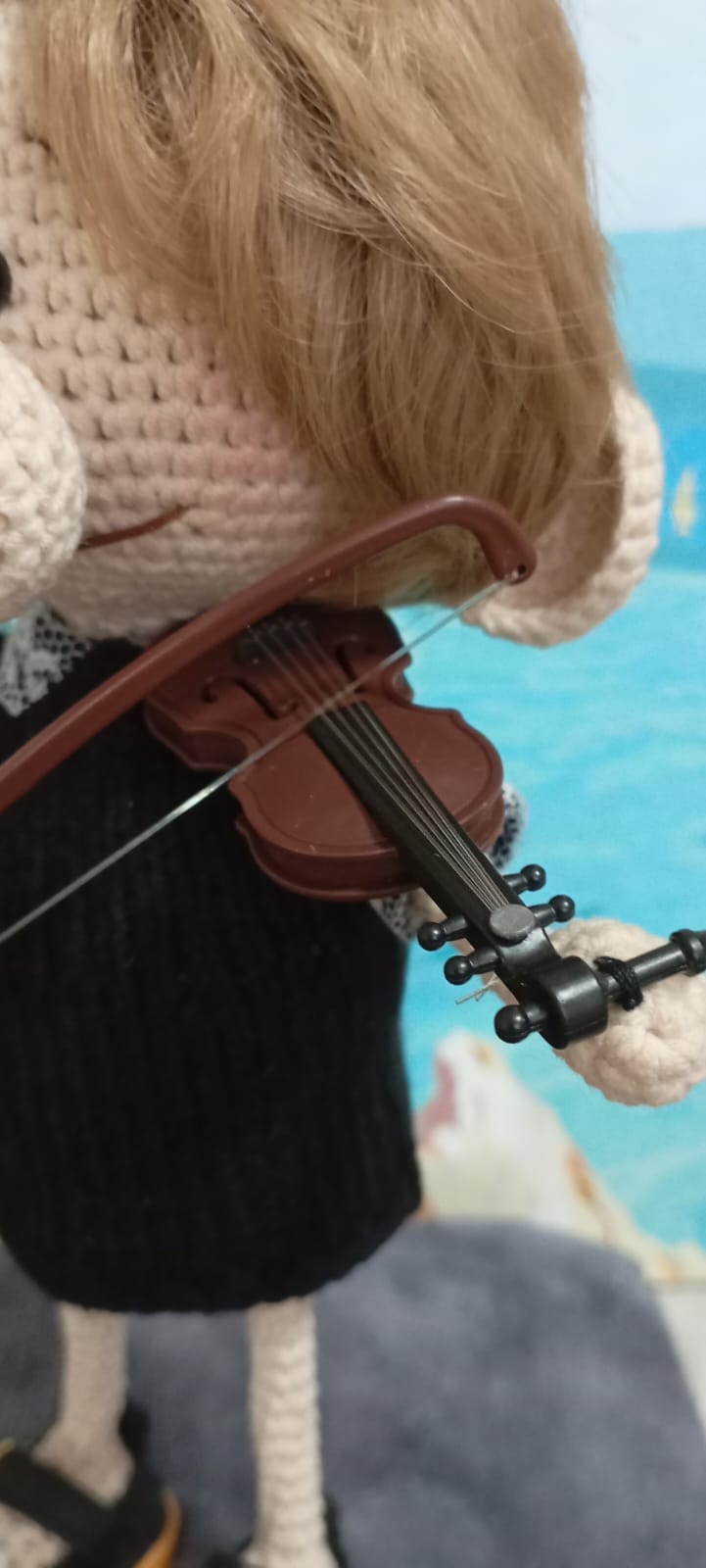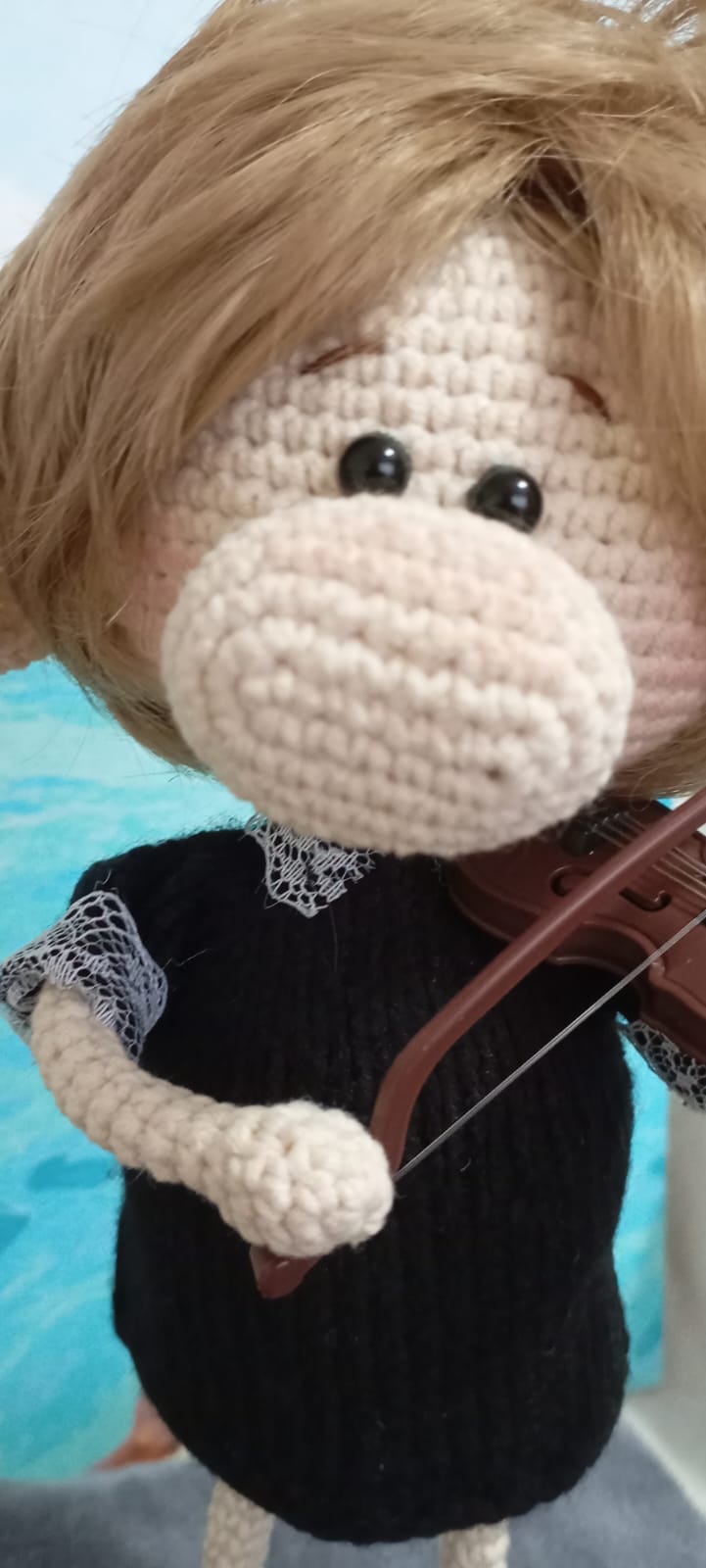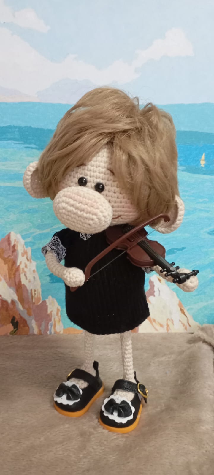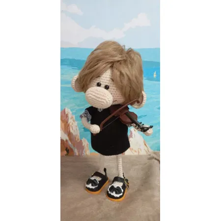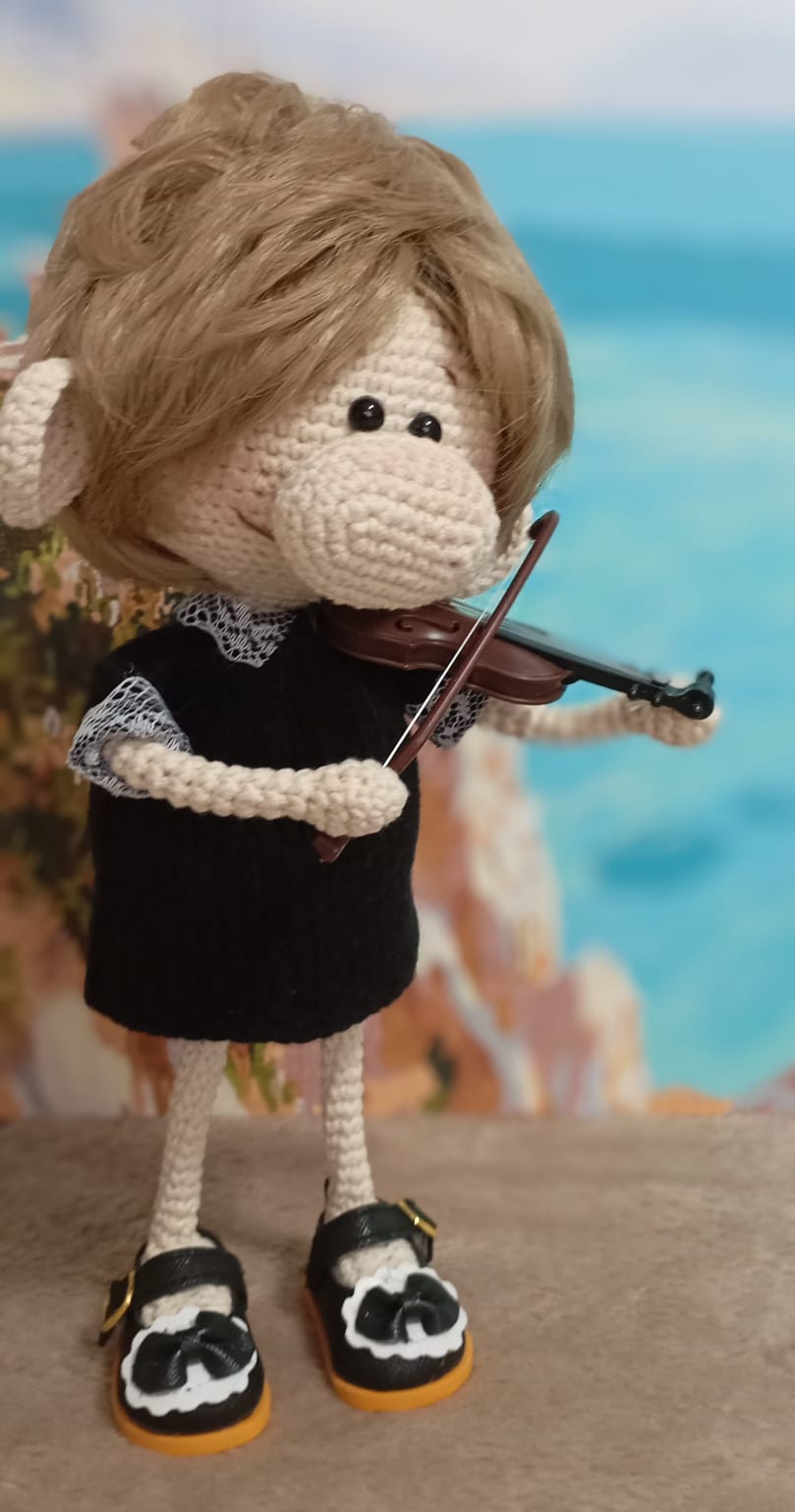 Очаровательная вязаная кукла, представляющая собой персонажа с милыми чертами. Она одета в стильное черное платье и туфли с декоративными элементами, что подчеркивает её уникальный вид. Особенностью этой куклы является наличие миниатюрной скрипки, которую она держит, создавая впечатление профессионального музыканта. Прекрасный подарок для любителей уникальных и креативных игрушек, выполненных с душой и заботой. Эта кукла станет замечательной частью интерьера или личной коллекции.