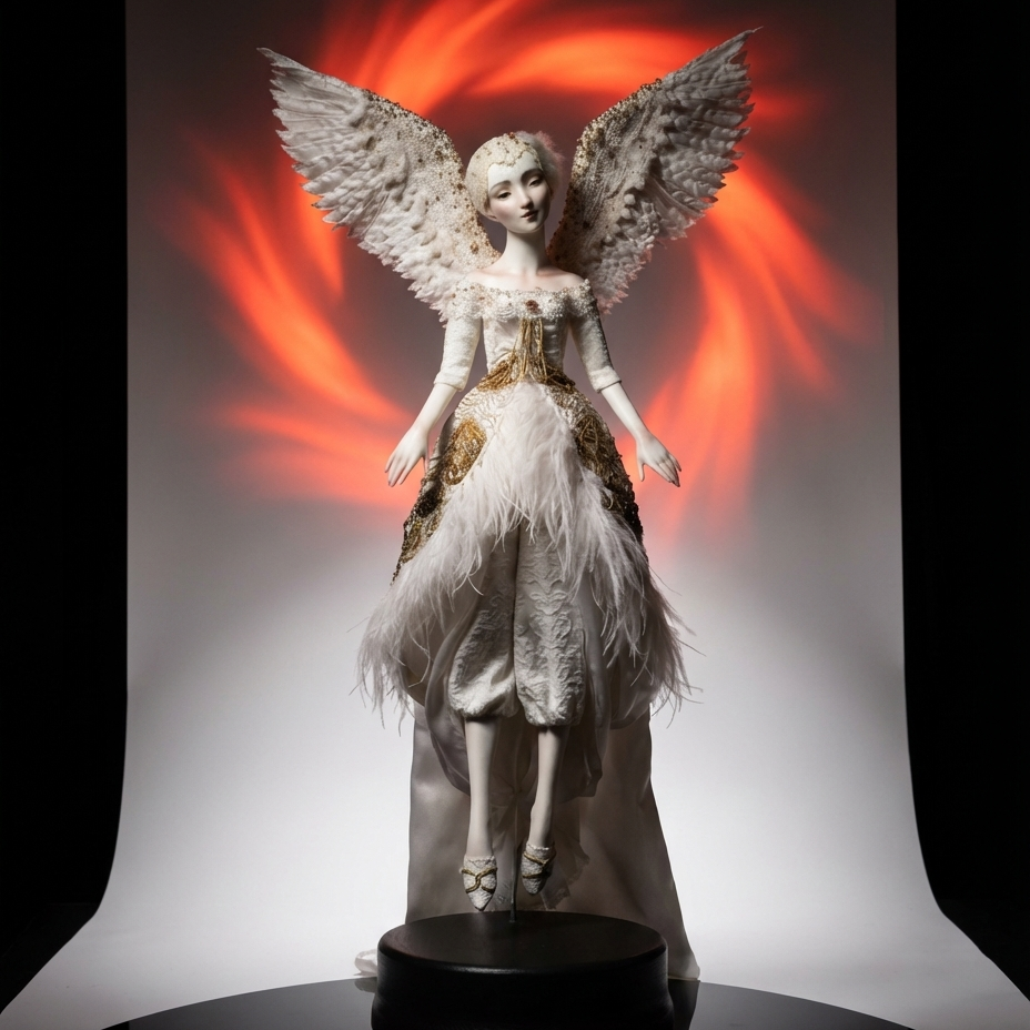 Материалы: бисквитный фарфор, надглазурная роспись, натуральный шёлк, перья, бисер, пайетки, стеклярус, полудрагоценные камни, ручная вышивка по шёлку, золотая канитель. Подставка: дерево.