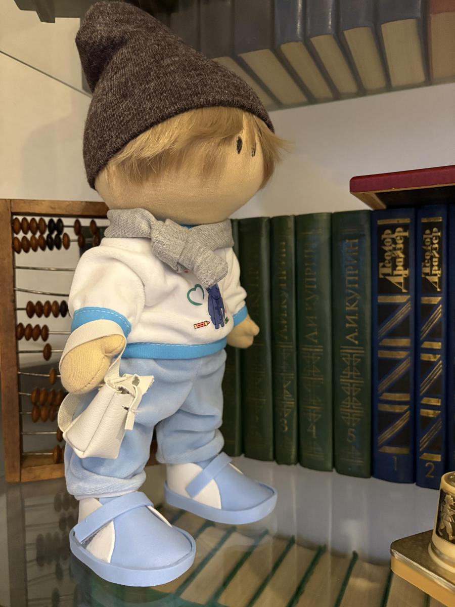 куколка текстильная интерьерная рост 30 см мальчик Ручки и ножки у куколки двигаются. Устойчиво стоит и сидит. Одежду можно снять.