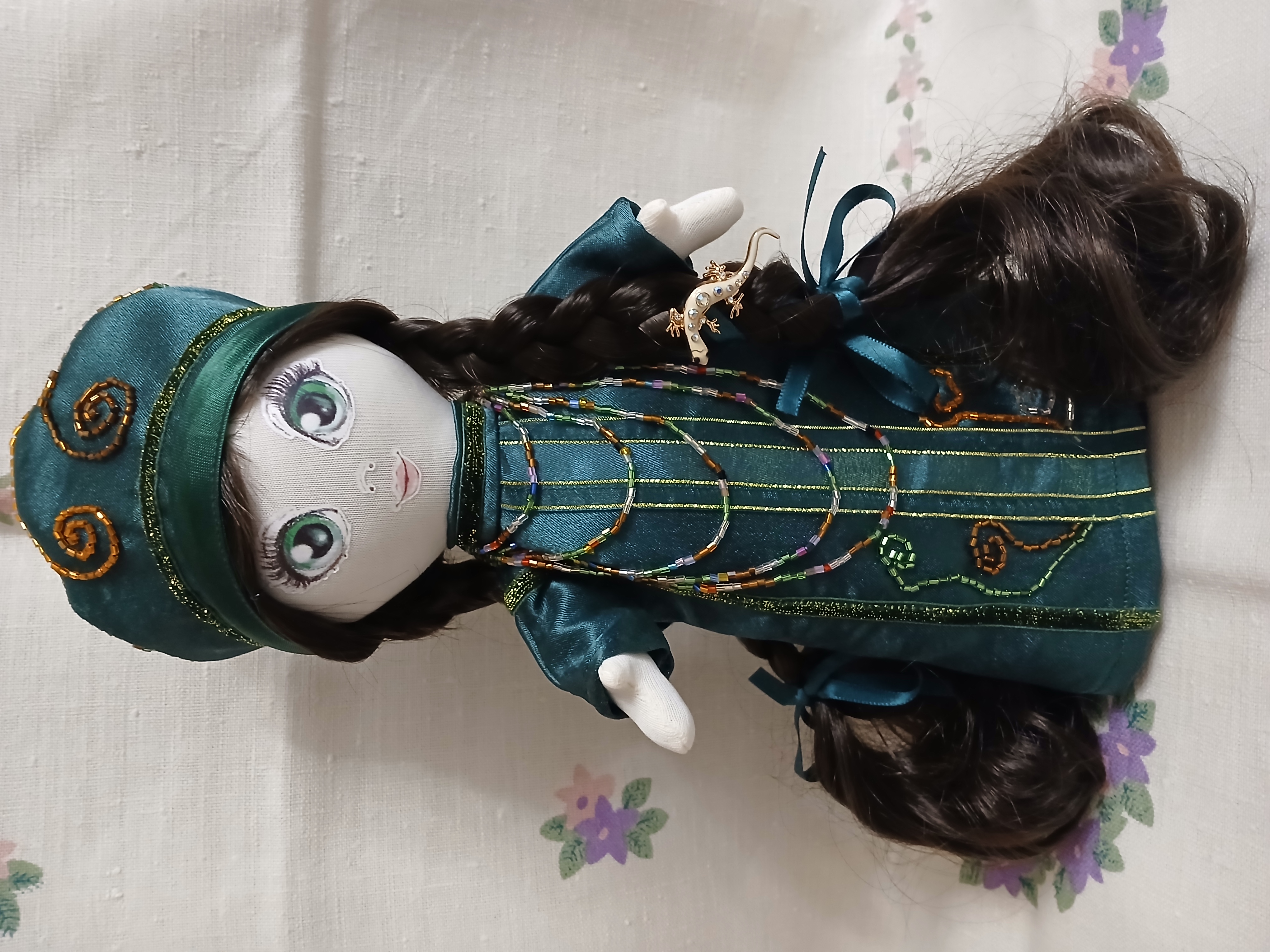 Интерьерная кукла ручной работы "Хозяйка медной горы", текстиль, синтепон. Рост 26 см, стоит без поддержки, ручки, ножки подвижные. Одежда, обувь, аксессуары съёмные.