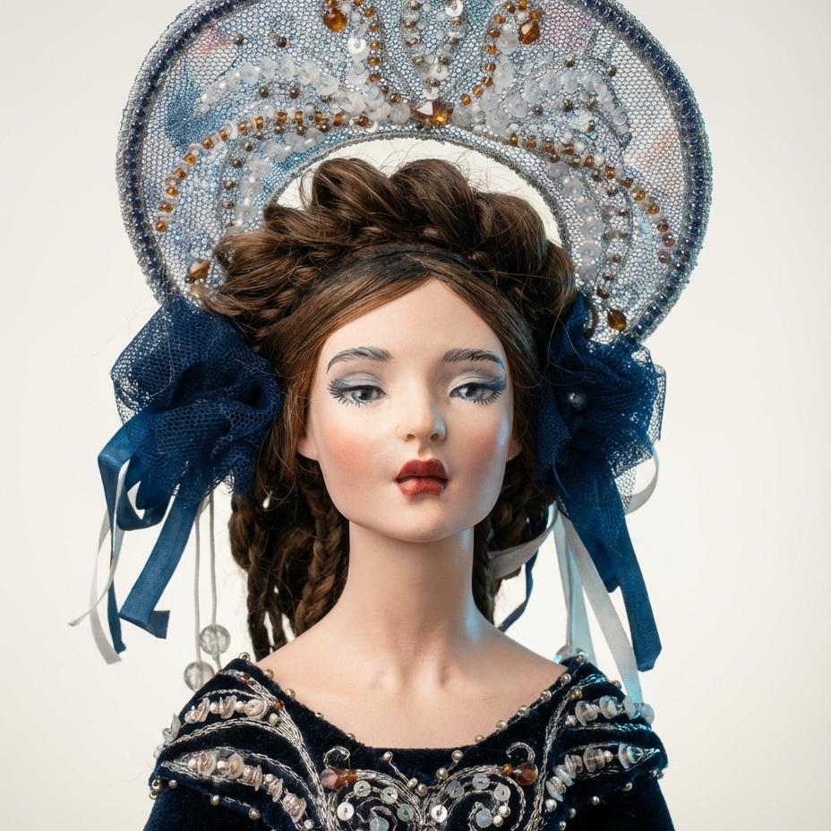 Материалы: английский фарфор Parian (бисквитный), роспись маслом, шерсть ангорской козы, шелк Армани, натуральный бархат, кутюрная вышивка, фатин, стеклянные бусины, бисер. Подставка: дуб. Статичная. Высота: 57 см.