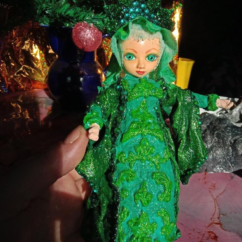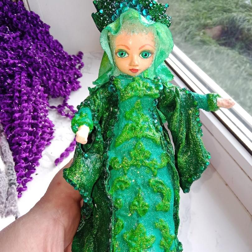 Ватная игрушка "Хозяйка Медной горы" - это потрясающее произведение искусства, которое воплощает в себе красоту и загадочность одноименного персонажа из сказки Павла Петровича Бажова. Она представляет собой женщину, одетую в роскошное платье из малахита, украшенное драгоценными камнями. На ее голове красуется корона, также изготовленная из малахита и золота.