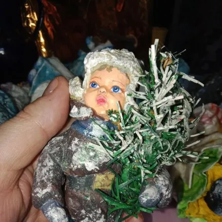Игрушка представляет собой маленького мальчика, одетого в теплый тулуп и шапку-ушанку. В руках он держит маленькую, но очень красивую елочку, украшенную разноцветными шарами и гирляндами. Лицо мальчика выражает радость и предвкушение праздника, а глаза блестят от счастья.