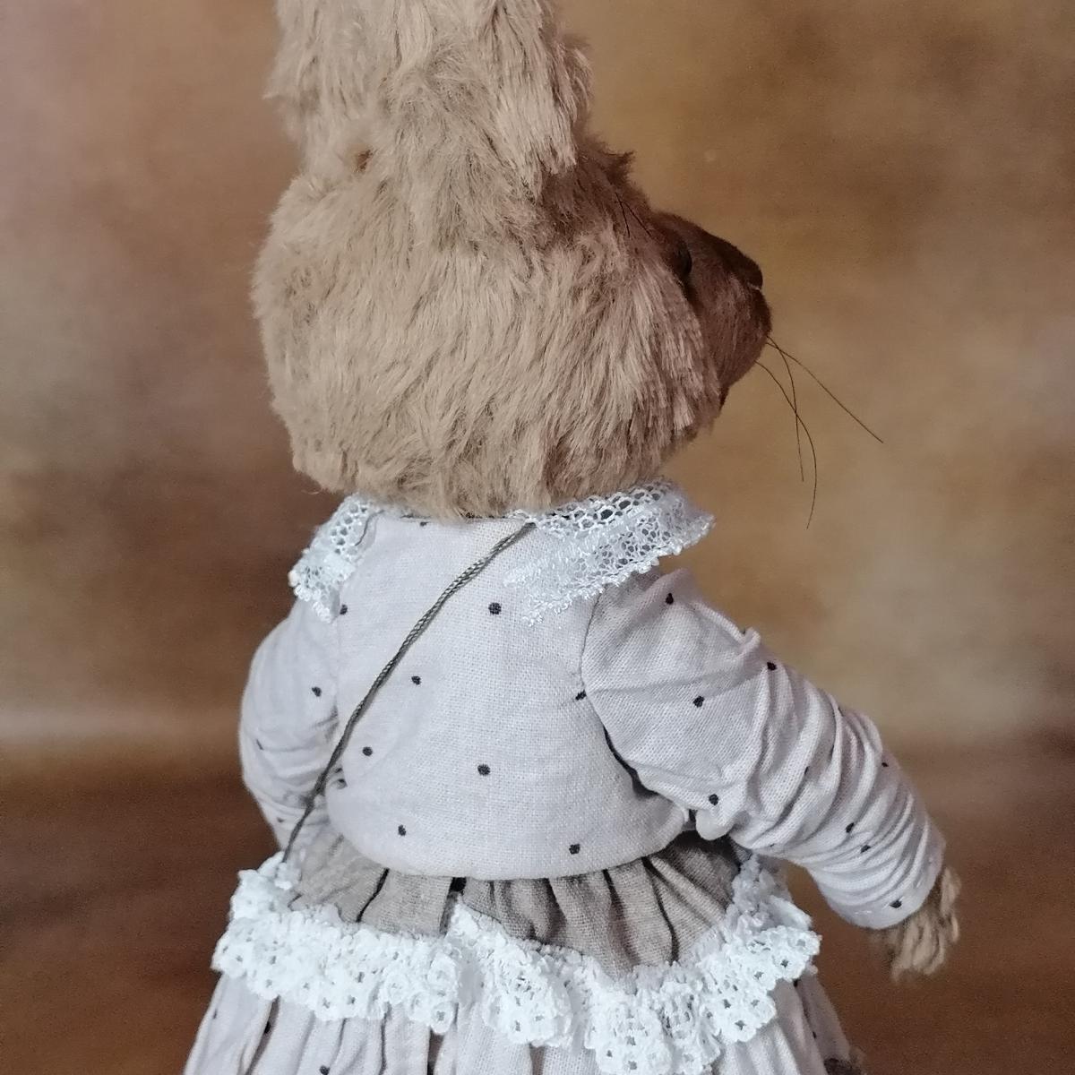 Зайчик, интерьерная игрушка, создан по технологии Тедди. Сшит из итальянской вискозы, набит сосновыми опилками, глазки стеклянные, шплинтовое крепление лап и головы. Рост 18см. Стоит с помощью подставки. Игрушка не предназначена для детей.