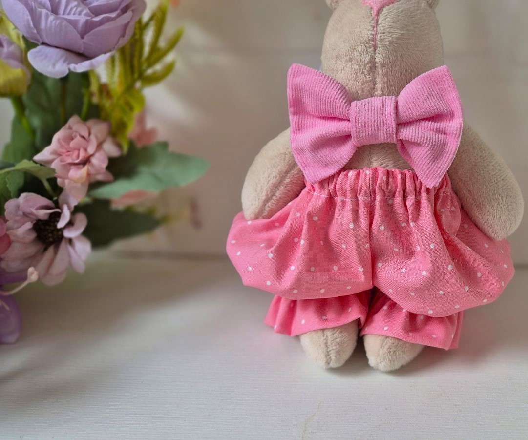 Этот очаровательный малыш создан из самого нежного плюша, который так и хочется обнять и не отпускать. В его образе — спокойствие, доброта и чуточку праздничного настроения, ведь он надел свои лучшие розовые штанишки и повязал галстук-бантик специально для встречи с вами.