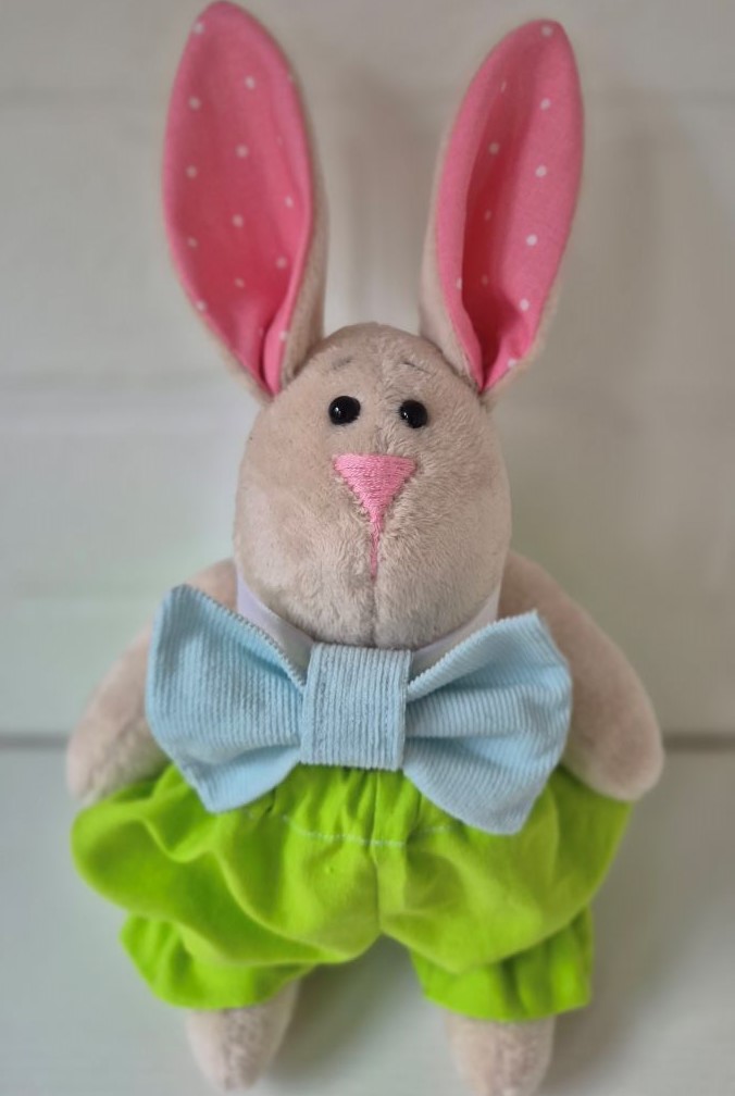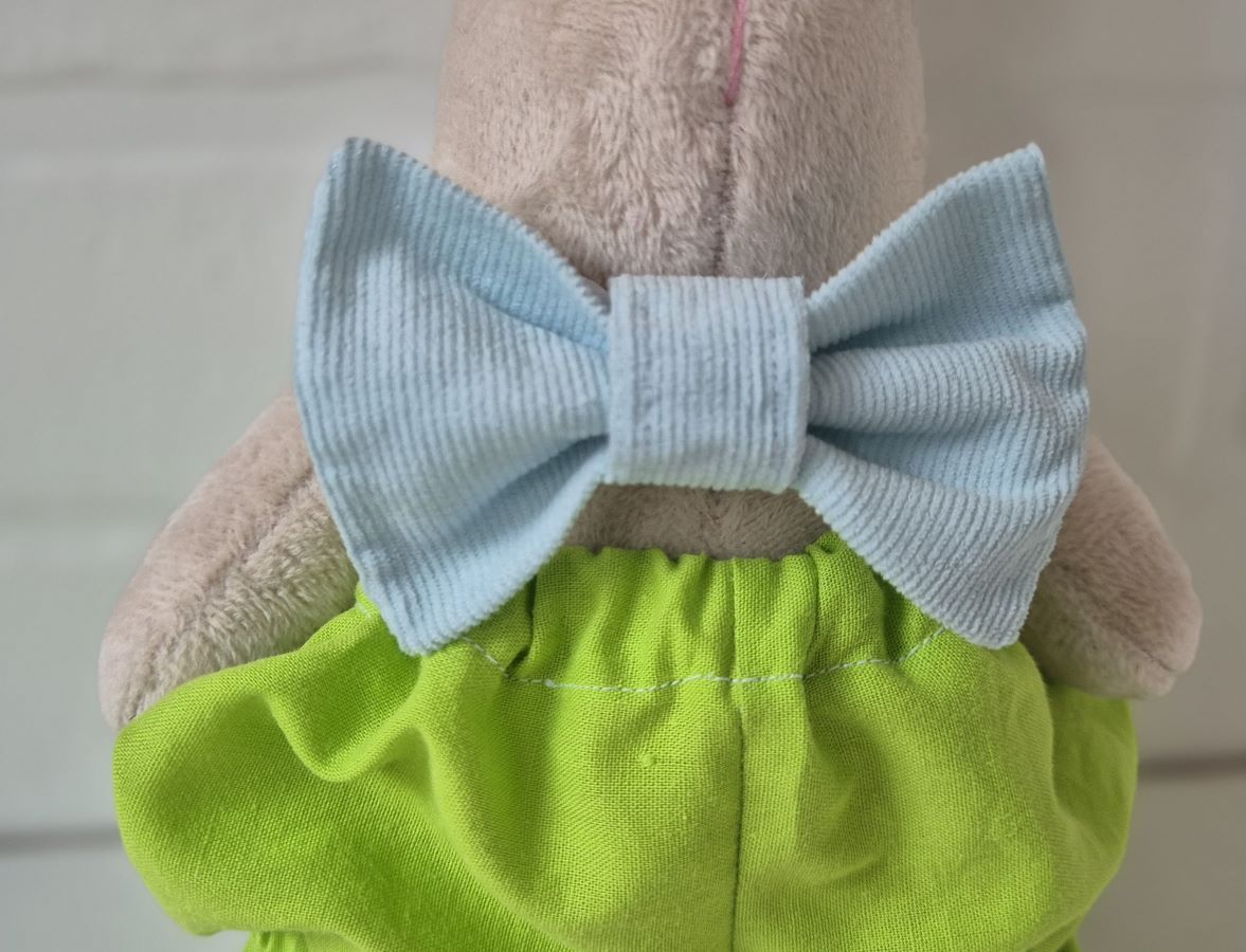 Яркие зеленые штанишки делают его заметным и поднимают настроение с первого взгляда. А аккуратный голубой галстук-бантик на шее добавляет образу трогательной элегантности. Это зайка, который умеет создавать праздник каждый день. Игрушка выполнена из мягчайшего плюша, приятного на ощупь и для детей, и для взрослых. Его хочется тискать, брать с собой и не выпускать из рук. Рост 25 см — это «золотой стандарт» для мягкой игрушки. Кролика удобно обнимать, он помещается в детский рюкзачок или сумочку, но при этом достаточно крупный, чтобы стать заметным другом, а не потеряться. Мордочка кролика выполнена с особой теплотой. В ней нет ни капли грусти — только спокойное, трогательно-доверчивое выражение, которое располагает к себе и взрослых, и детей.