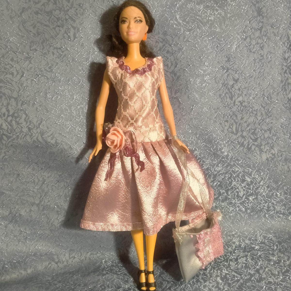 Платье и сумочка для куклы Барби. Розовое (не знаю как правильно называется этот цвет, извините) платье, атласное, лиф украшен гипюром и цветком. Застегивается на кнопки (пришивные). Для игры детям любого возраста (делям, которые могут отгрызть мелкие детали не рекомендую). В комплекте сумочка. Платье сшито достаточно свободно - подойдет для любой Барби. Одежды для кукол много, заходите на мою страничку. При покупке от 3 нарядов подарок (на мое усмотрение). ВНИМАНИЕ - кукла не продается!