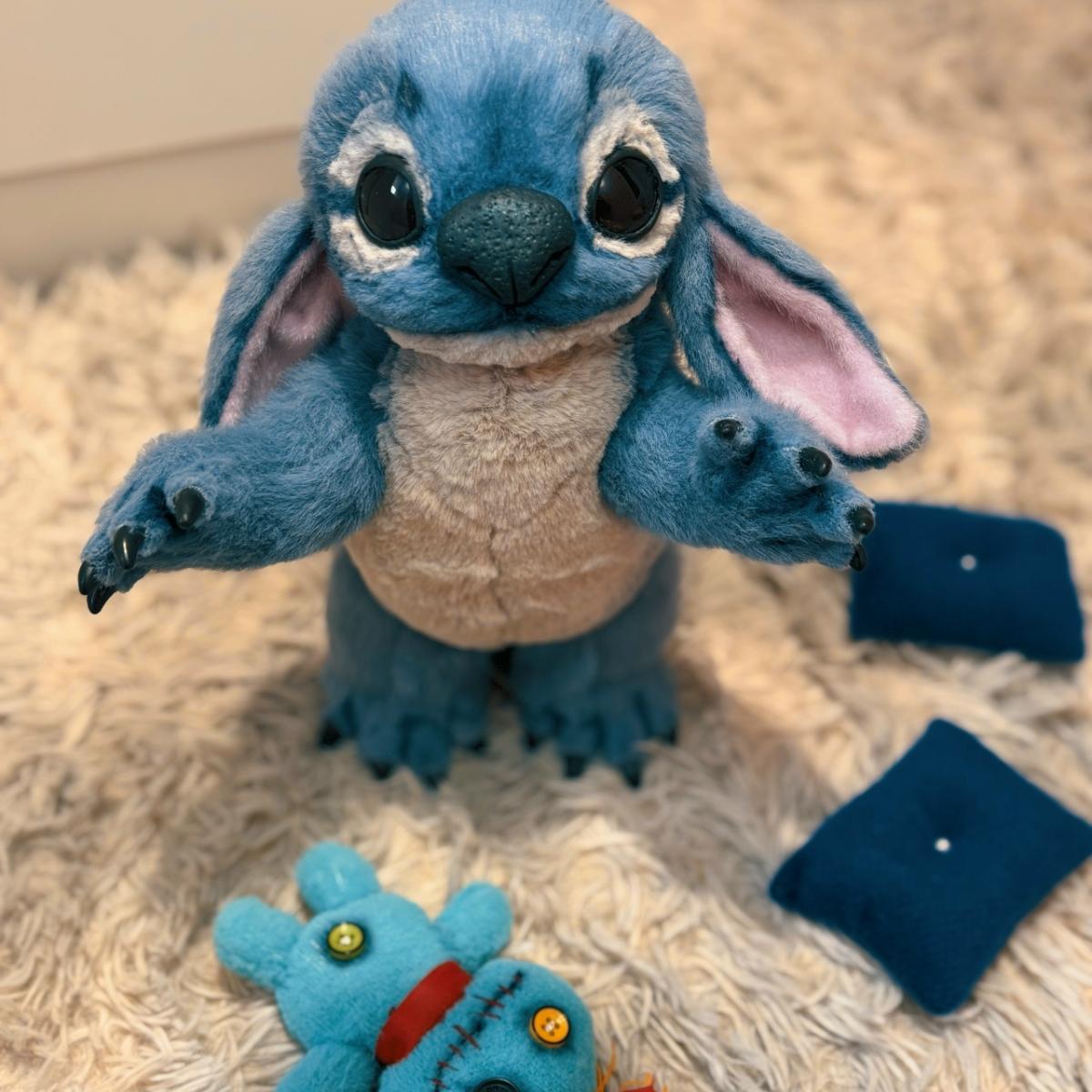 Сделан Стич из искусственного меха под норку Внутри пластиковый скелет ,полностью он подвижный !Даже каждый пальчик на руках и ногах гнется . Ушки армированные и внутри тоже пластиковый скелет ,они поднимаются и опускаются . Рост 26 см . Нос из полимерной глины ,твердый , глаза стеклянные . Готов к переезду!